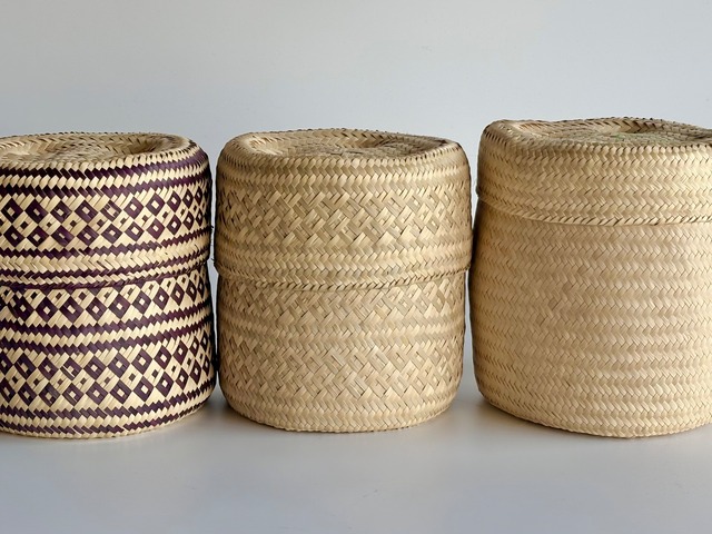 ラオスで、蒸したもち米を入れるために使われている伝統的な入れ物です。 竹を用いて、一つ一つ手作業で編まれています。 軽く、愛嬌のあるかたち。置いておくだけでも絵になります。細いナイロン製のコードがついています。持ち運びに◎ ・素材 竹 ・サイズ 蓋 直径:約10.5cm 身 直径:約10cm 高さ:約8.5cm~約9cm ※多少ゆがみがありますが味わいとしてご理解ください。 ※出来る限り実物と同じ色合いになるように撮影を心がけておりますが、お客様のご使用のパソコン・液晶モニターの色調補正設定等により実物と異なって見える場合がございます。ご了承ください。 また、実店舗での販売もしておりますのでご注文の時点で欠品している場合がございます。 在庫管理についてできる限りすぐ更新するよう心掛けておりますが、万一欠品の際はご了承くださいませ。