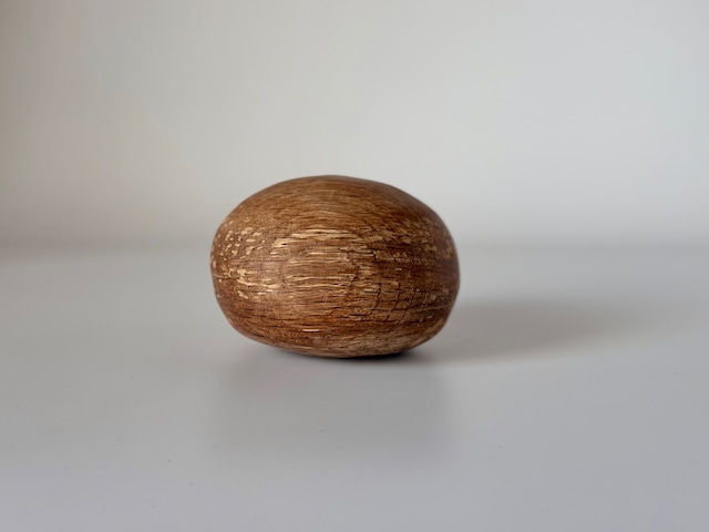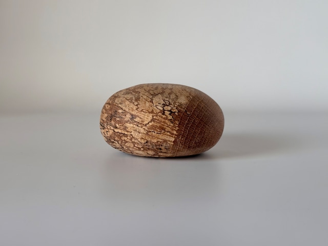 ふし、かけ、虫食い…… 一見、ものづくりには不向きとされる部分。 その部分をあえてそのまま活かしながら、自然のままの姿に宿る美しさを、静かにすくい上げるような、そんな木村さんの作品たち。 小さな傷跡までもが愛おしく思え、暮らしの中で寄り添い生き続けます。 用途を持たないただの丸い玉。 撫で撫でしてもよし、棚に無造作に転がしてもよし。 本を積み上げた上に置いたり、ペーパーウエイトとして、またお好きなCD数枚、挟んでも良いかと。(ブックエンドではないので、、しっかり挟めるわけではありませんが) 用途がない分、考えるのが楽しいです。 木をよく見ると、濃淡のグラデーション。木がどこから成長をはじめ、どう年を重ねてきたのか。その記録がこの球体の中で静かに語られているようです。 ●素材 木 アベマキ ●サイズ 縦横:約10.5cm~約11cm 高さ約5.5cm (1枚目画像 左 7枚目画像 左) 割れについて 木は生きている素材です。 乾燥や湿度の変化など、置かれる環境によって小さな割れが生じることがあります。 木の特性としてご理解いただければ幸いです。 ※ お手入れについて 仕上げには、食器にも使える木工用蜜蝋オイルを使用しています。 時間とともに表面が乾いてくる場合がありますので、乾燥が気になった際は蜜蝋オイルや木工用オイルでやさしく拭いていただくと、風合いが長持ちします。 ※出来る限り実物と同じ色合いになるように撮影を心がけておりますが、お客様のご使用のパソコン・液晶モニターの色調補正設定等により実物と異なって見える場合がございます。ご了承ください。 また、実店舗での販売もしておりますのでご注文の時点で欠品している場合がございます。 在庫管理についてできる限りすぐ更新するよう心掛けておりますが、万一欠品の際はご了承くださいませ。 ----------------------------------- 木村 陽平 ― 木こり 割れも、虫食いも、 木が生きた時間の痕跡。 手におさまる器に、 空間に灯るシェードに、 森で伐った木の続きを、 そっと作品に写し込む。