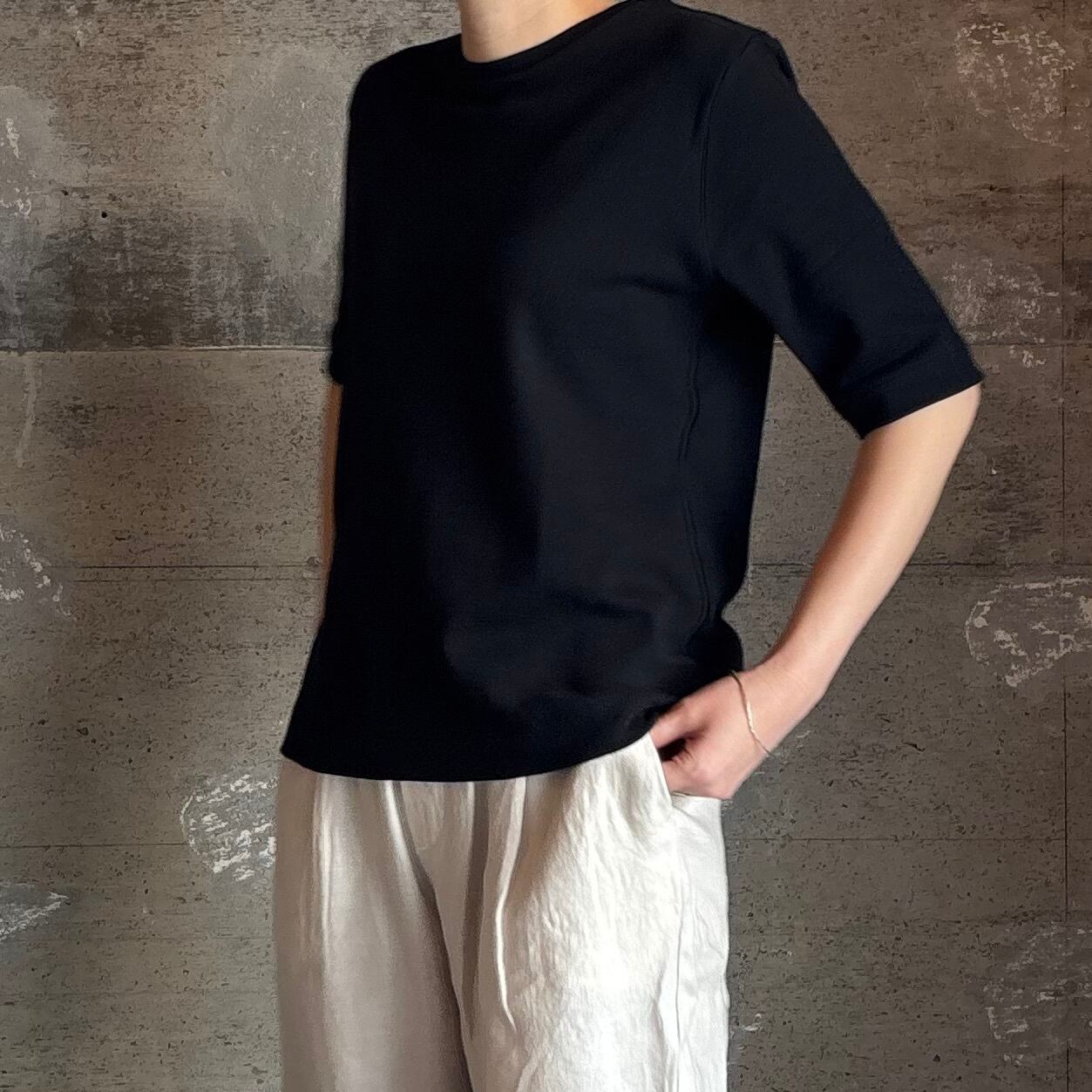 オーガニックコットンを使用した着心地の良いTシャツです。肌触りが心地よく、伸縮性があります。程よく厚みがあり、インナーの透けもさほど感じません。丈が長めなデザインでインしてもコーディネートが綺麗にきまります。二の腕が隠れる5分袖がうれしいポイント。身幅はストレートなデザインで綺麗な大人Tシャツです。