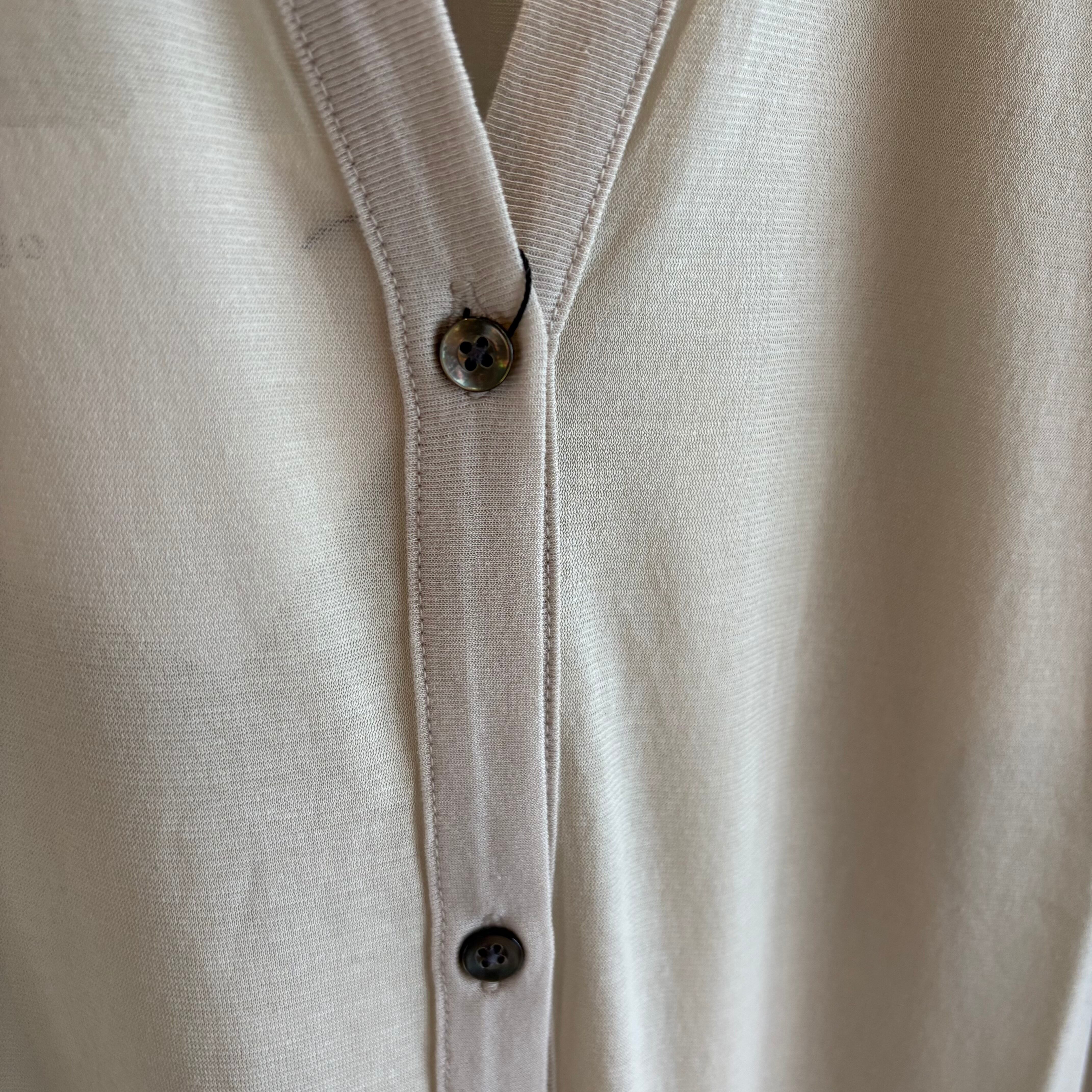 7分丈のロングカーディガン。サラサラ感とストレッチがきいた生地を使用し、夏場などはクーラーの寒さ対策におすすめです。動くとゆらゆらと生地が揺らぎ、軽やかさがあります。メーカー色表記はライトグレーですが、生成りのような色味。優しい色合いで様々なお洋服に合わせやすいです。