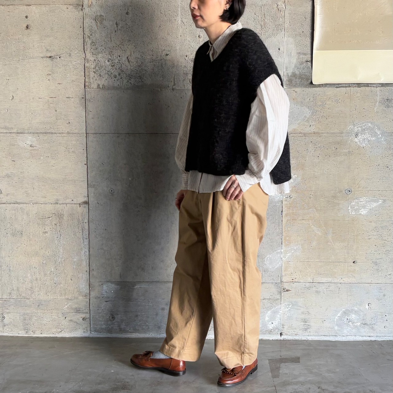 毛羽の少ない厳選されたコンパクトヤーンが使用されており、高密度に織り上げたチノ素材。キレイ目ながらもカジュアルさとドレッシーな雰囲気を併せもったパンツです。