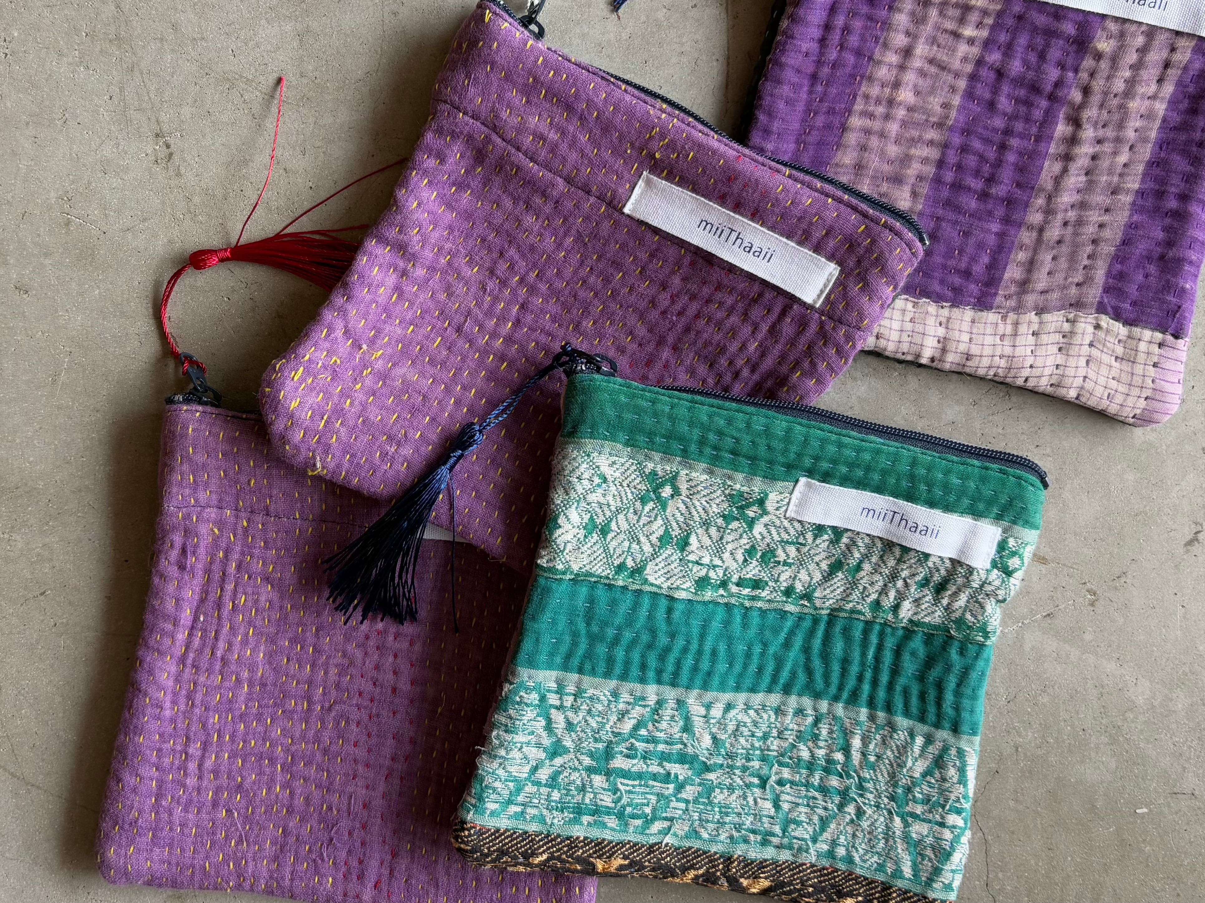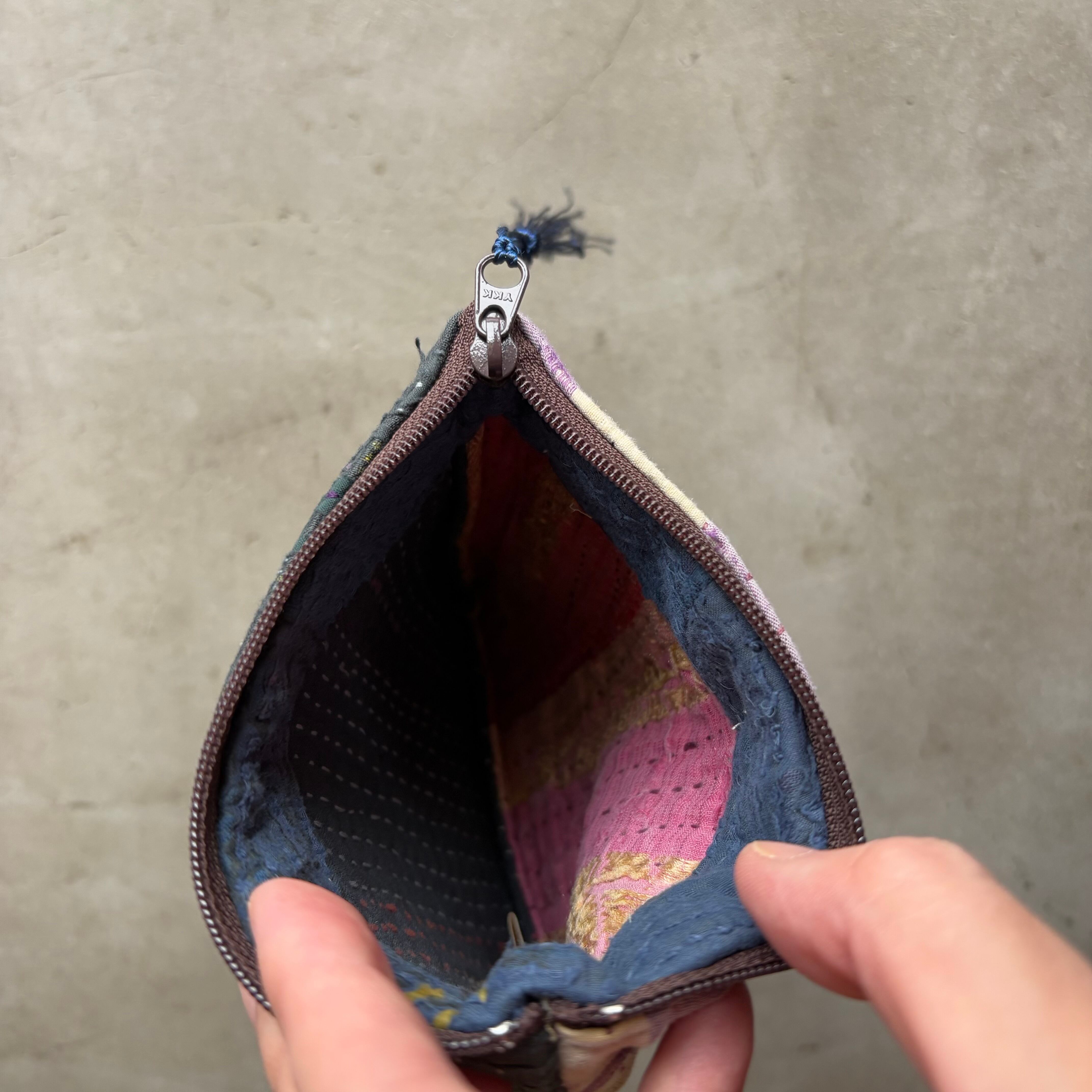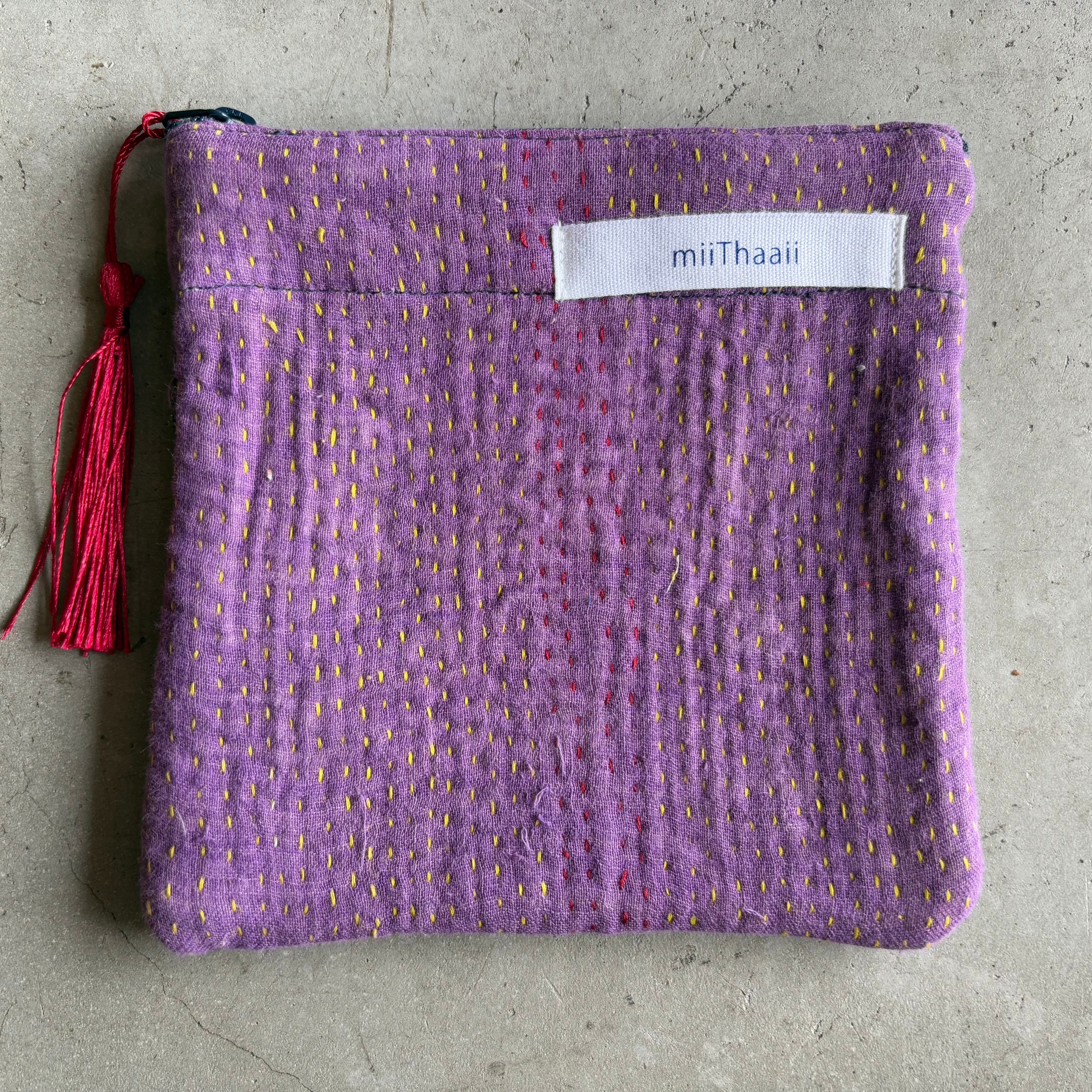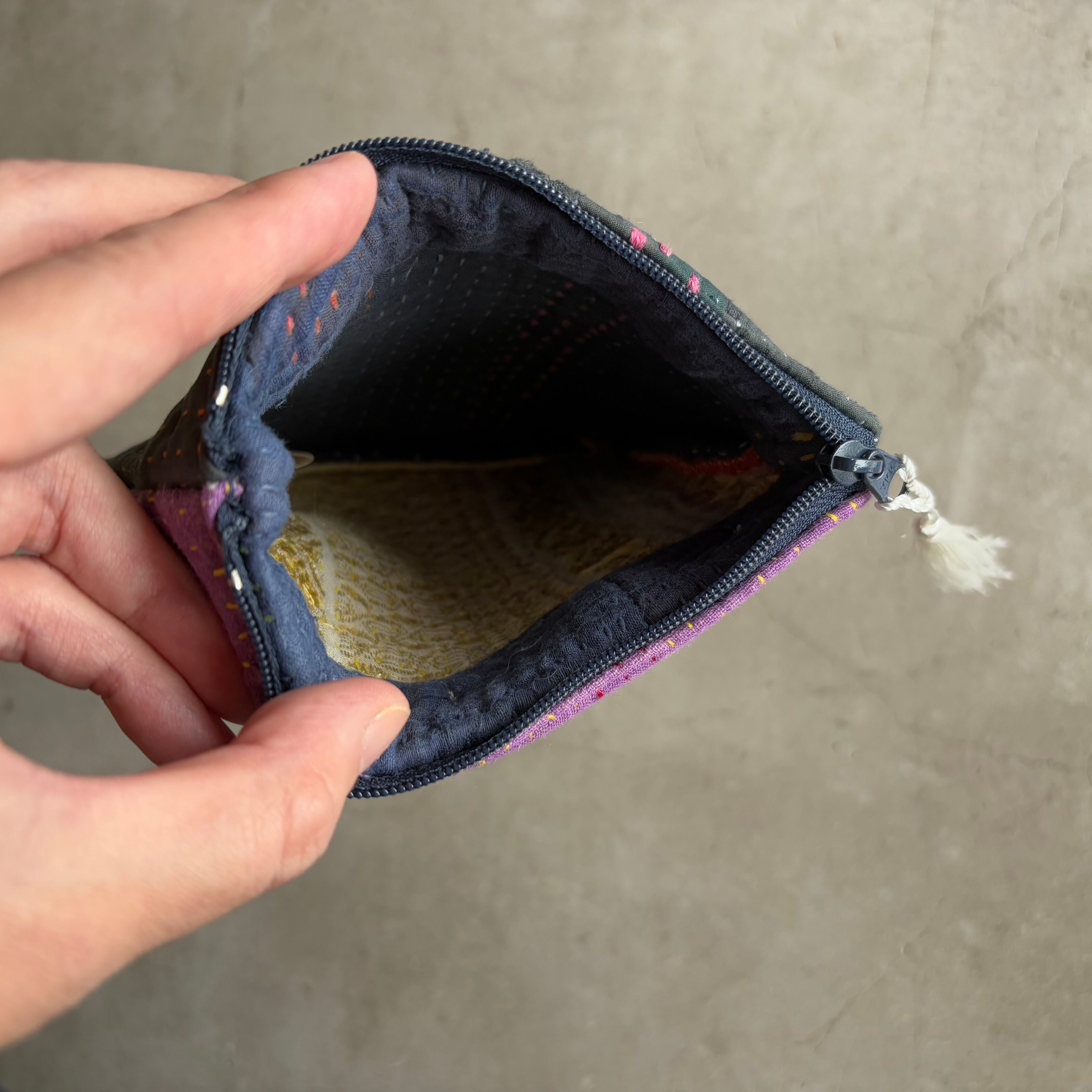 インドの伝統工芸「カンタキルト」で仕立てた、タッセル付きのジッパーポーチ。カンタキルトは、ヴィンテージの布地をベースに、色鮮やかな生地を幾重にも重ねて縫い合わせ、細やかな刺し子を施して仕上げられた、インドに古くから伝わる手仕事のひとつです。