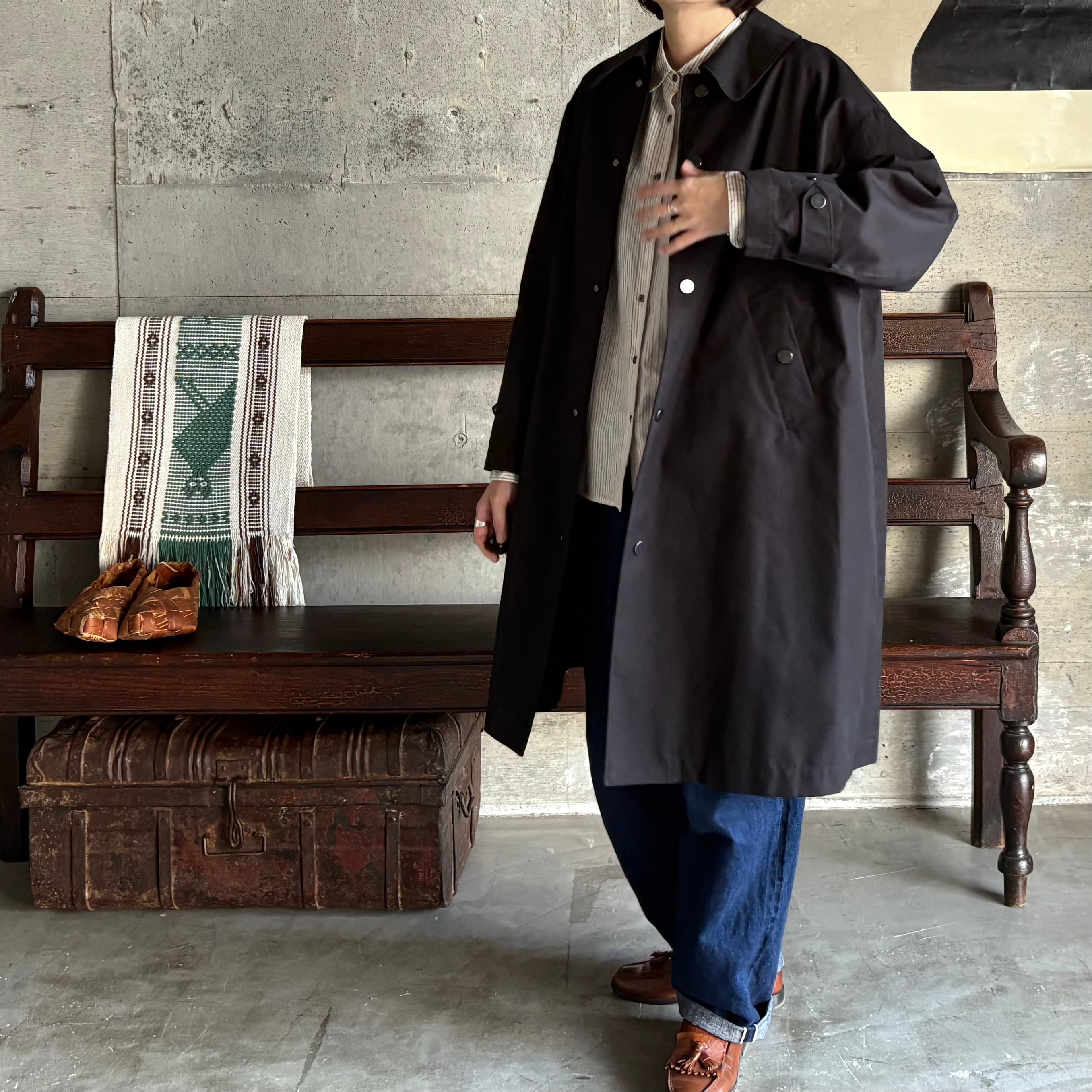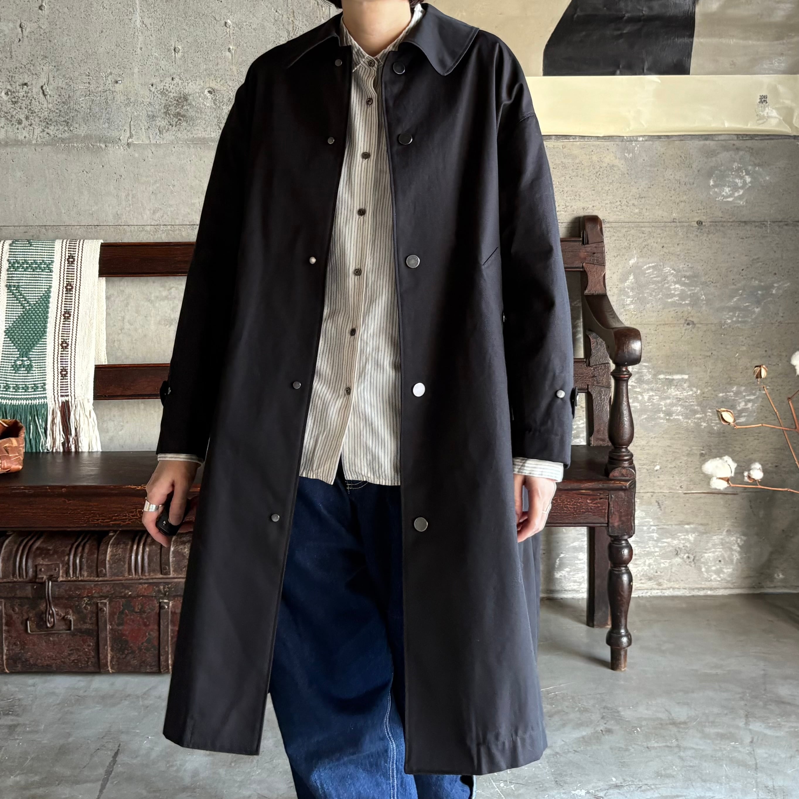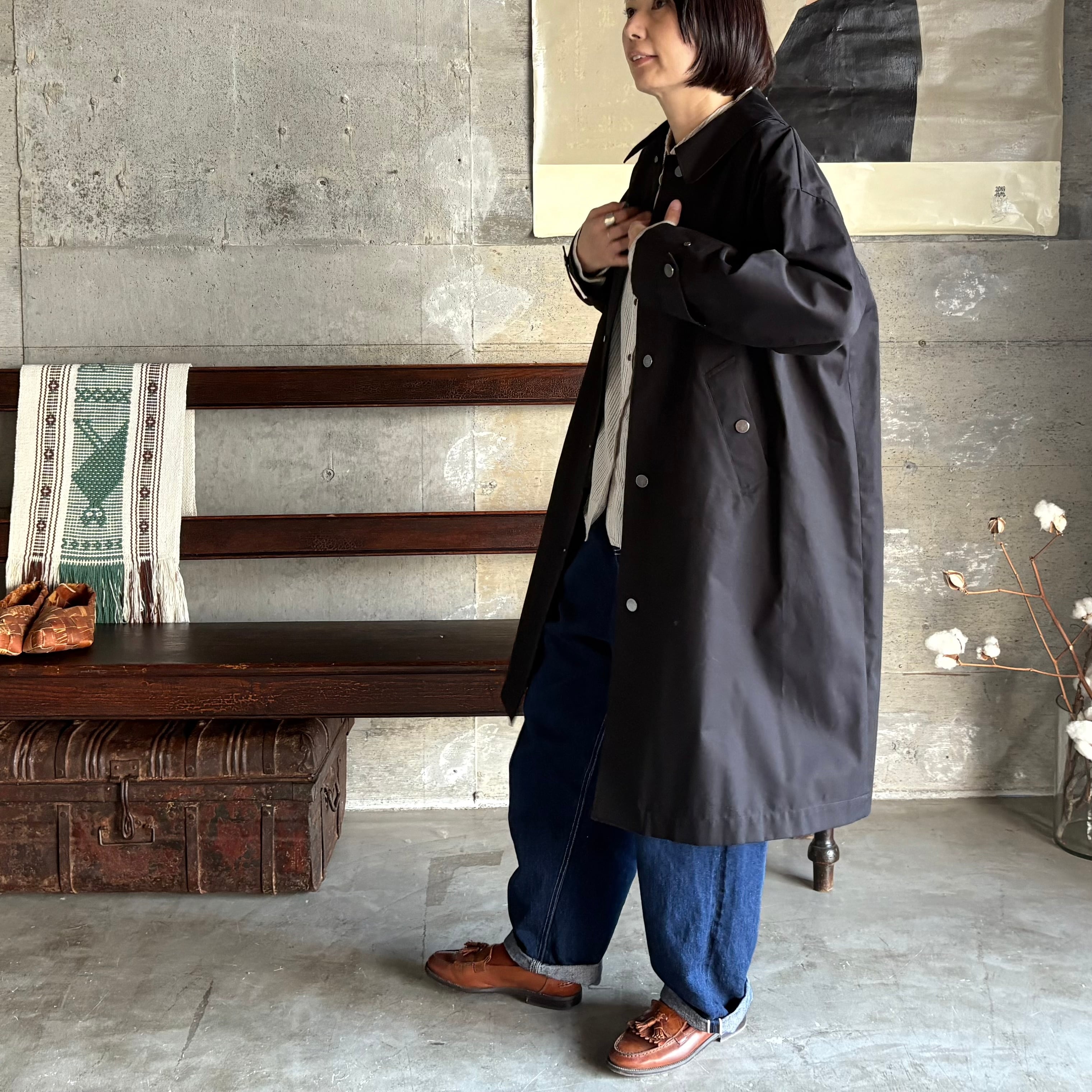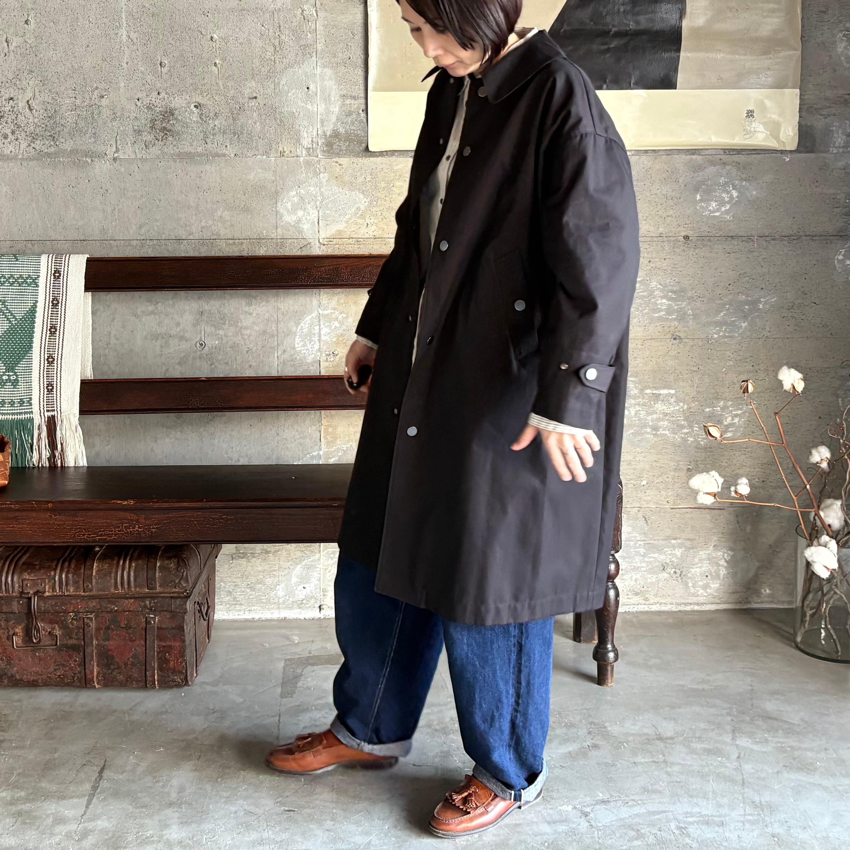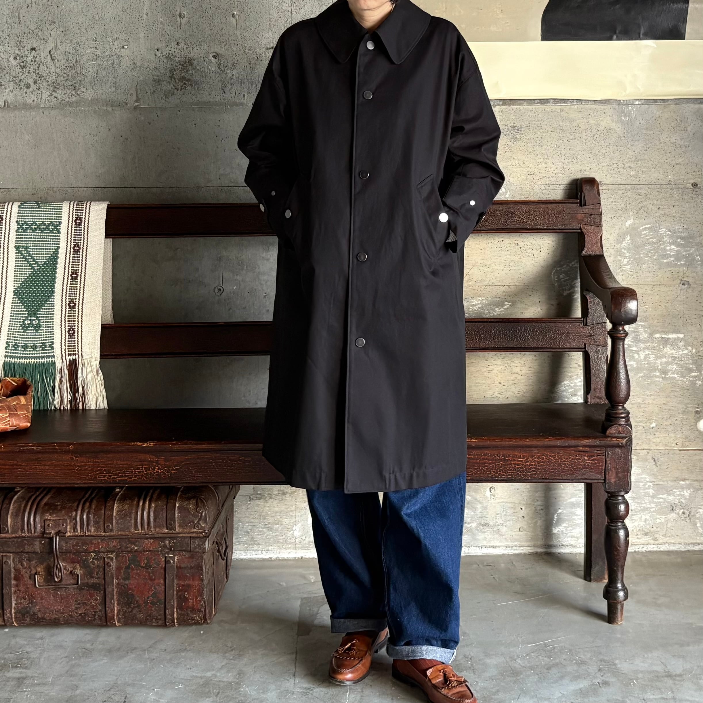 高密度で織った先染めの生地が使用されています。撥水加工が施されており、ハリ感があり、綺麗めコーディネートに仕上がります。落ち着いたフラットシルバー釦で生地の雰囲気を静かに整えてくれます。ブラックはあらたまった場でも映え、頼りになる1枚です。