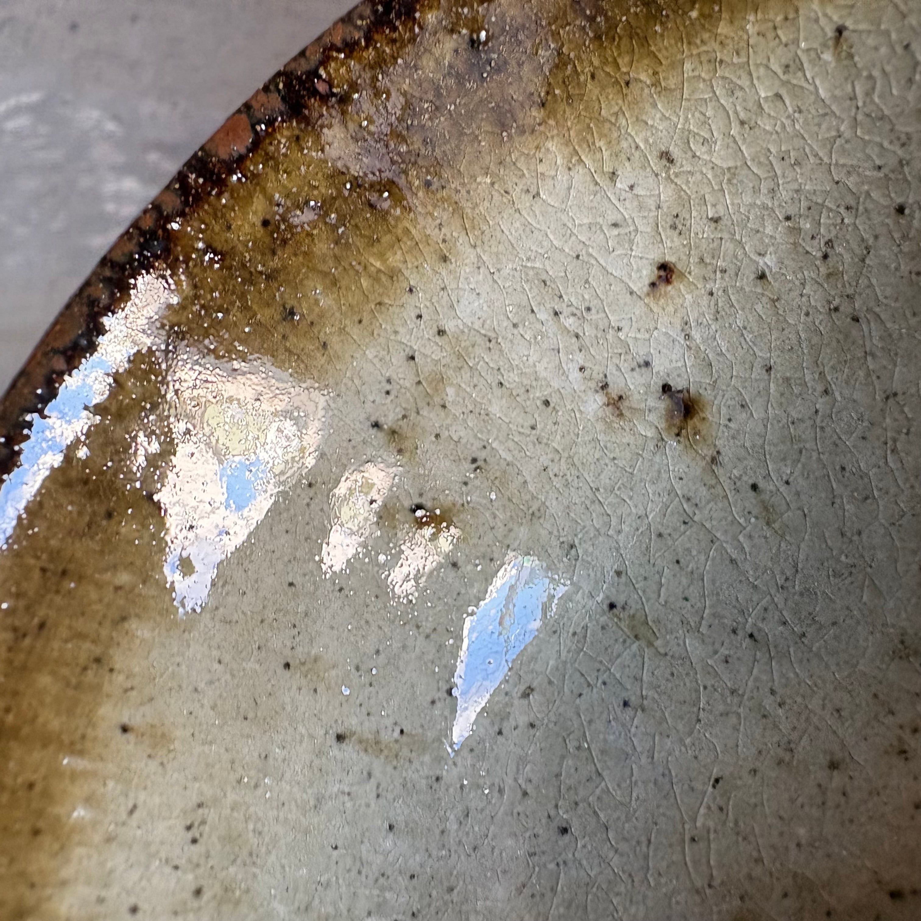 こげ茶色の濃淡で表情の揺らぎを感じます。中の、青い釉薬の垂れが神秘的でとても綺麗です。