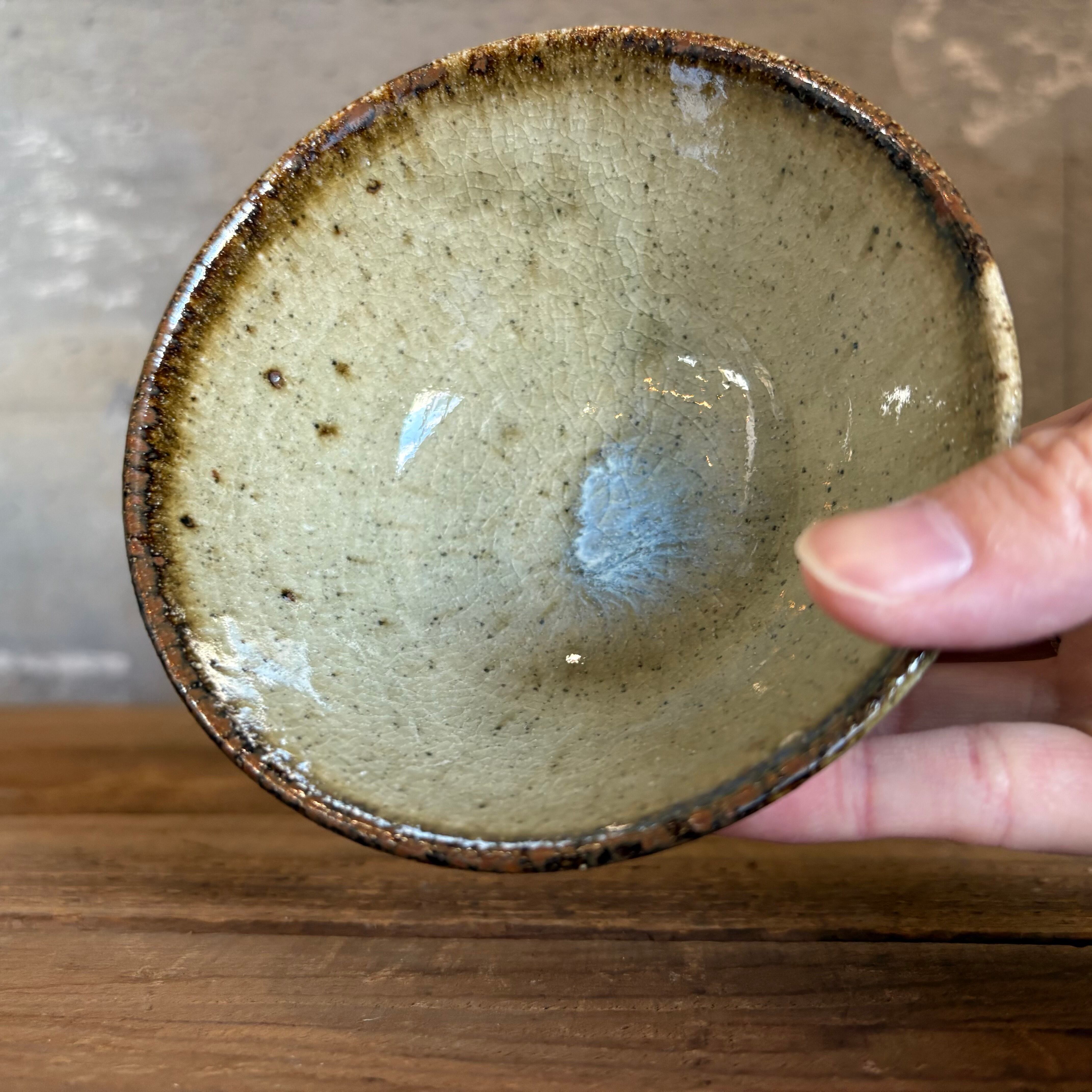 こげ茶色の濃淡で表情の揺らぎを感じます。中の、青い釉薬の垂れが神秘的でとても綺麗です。