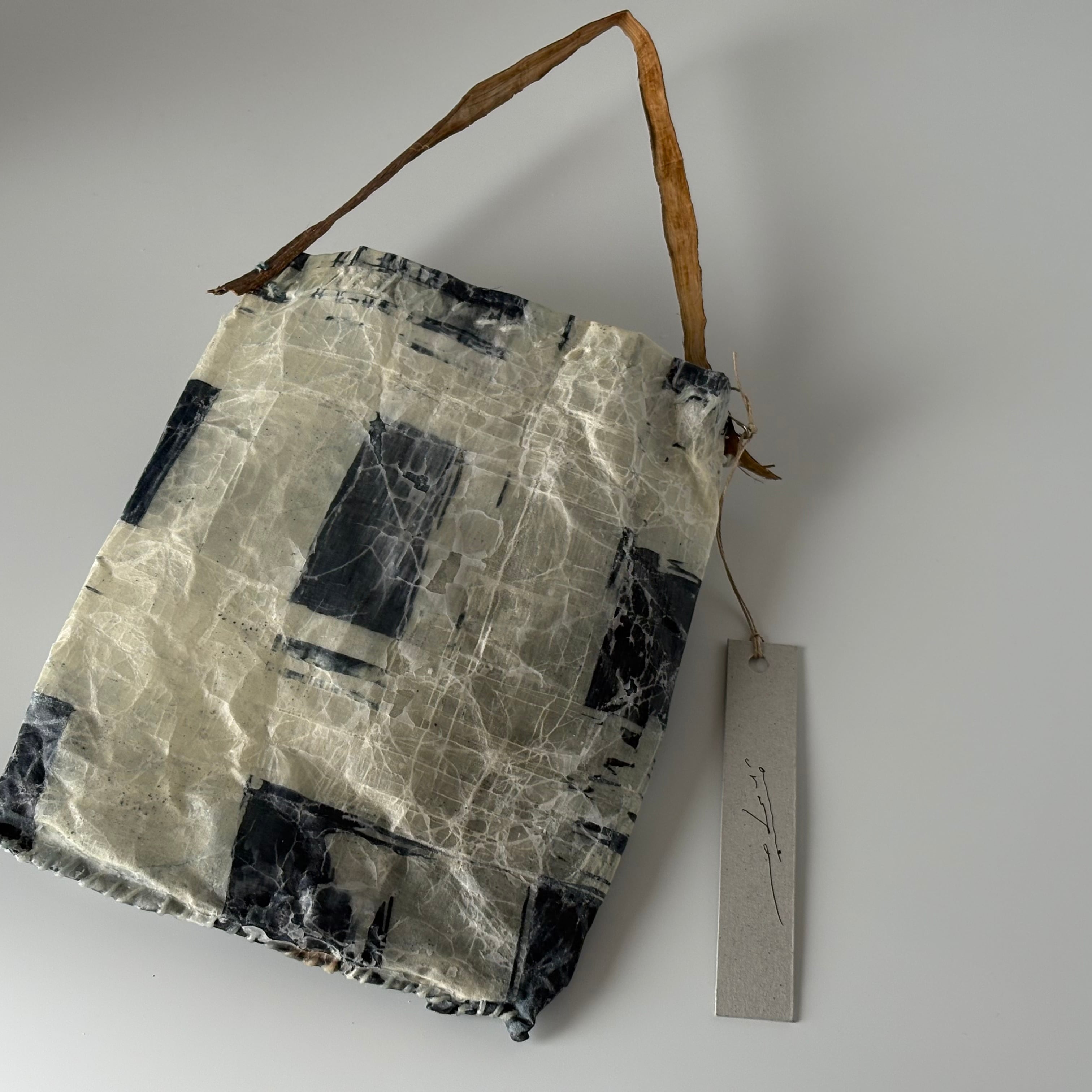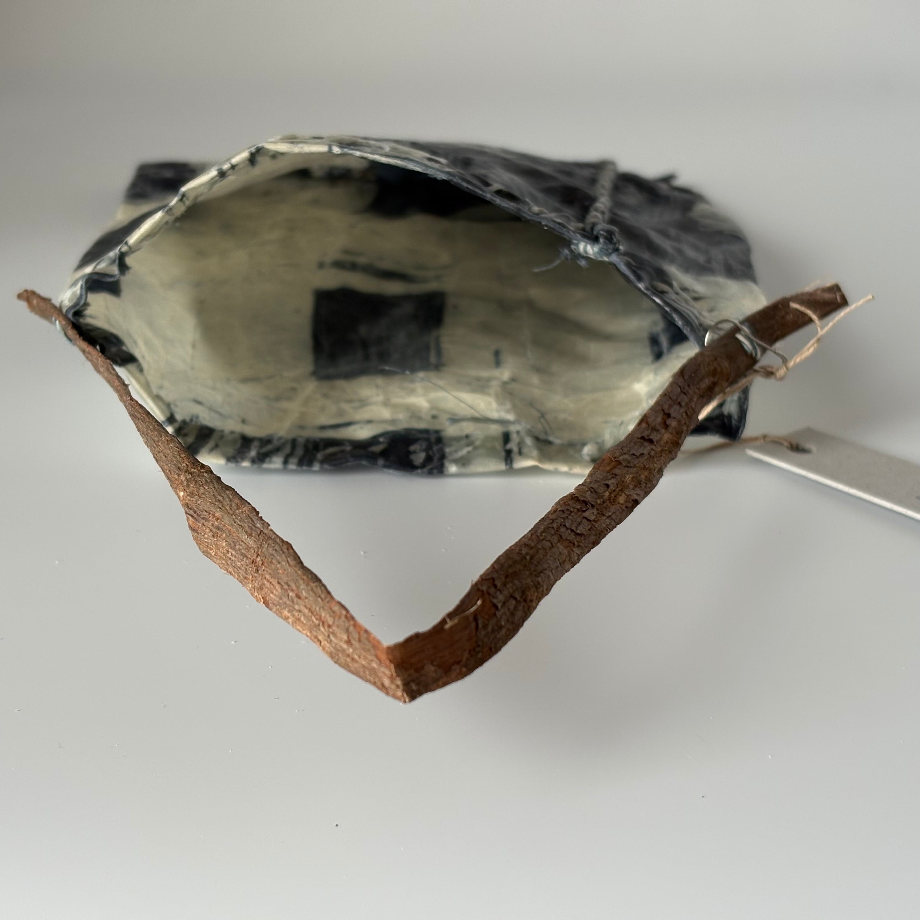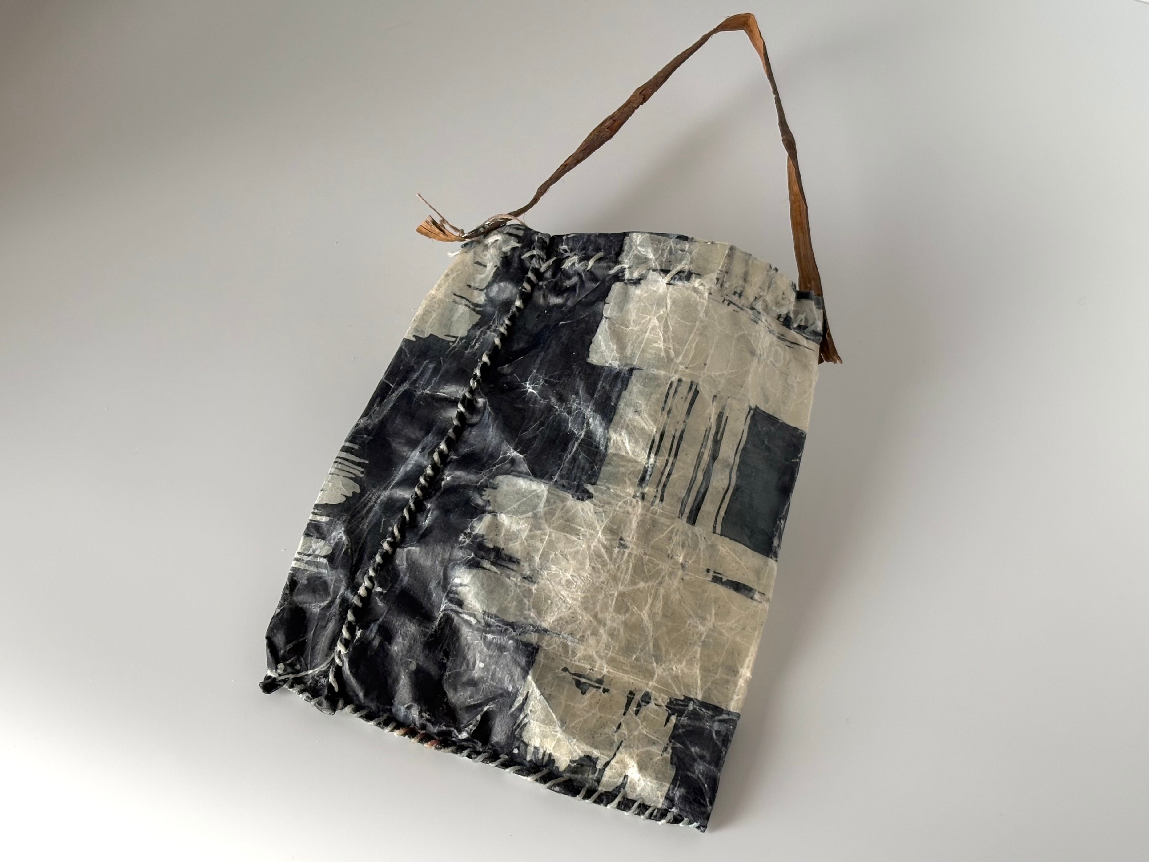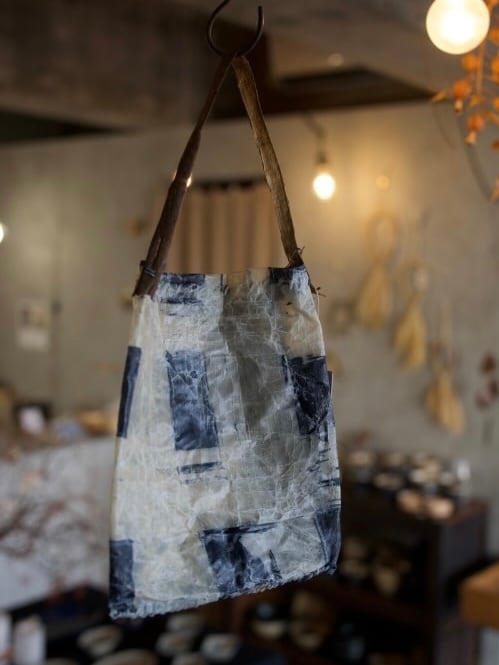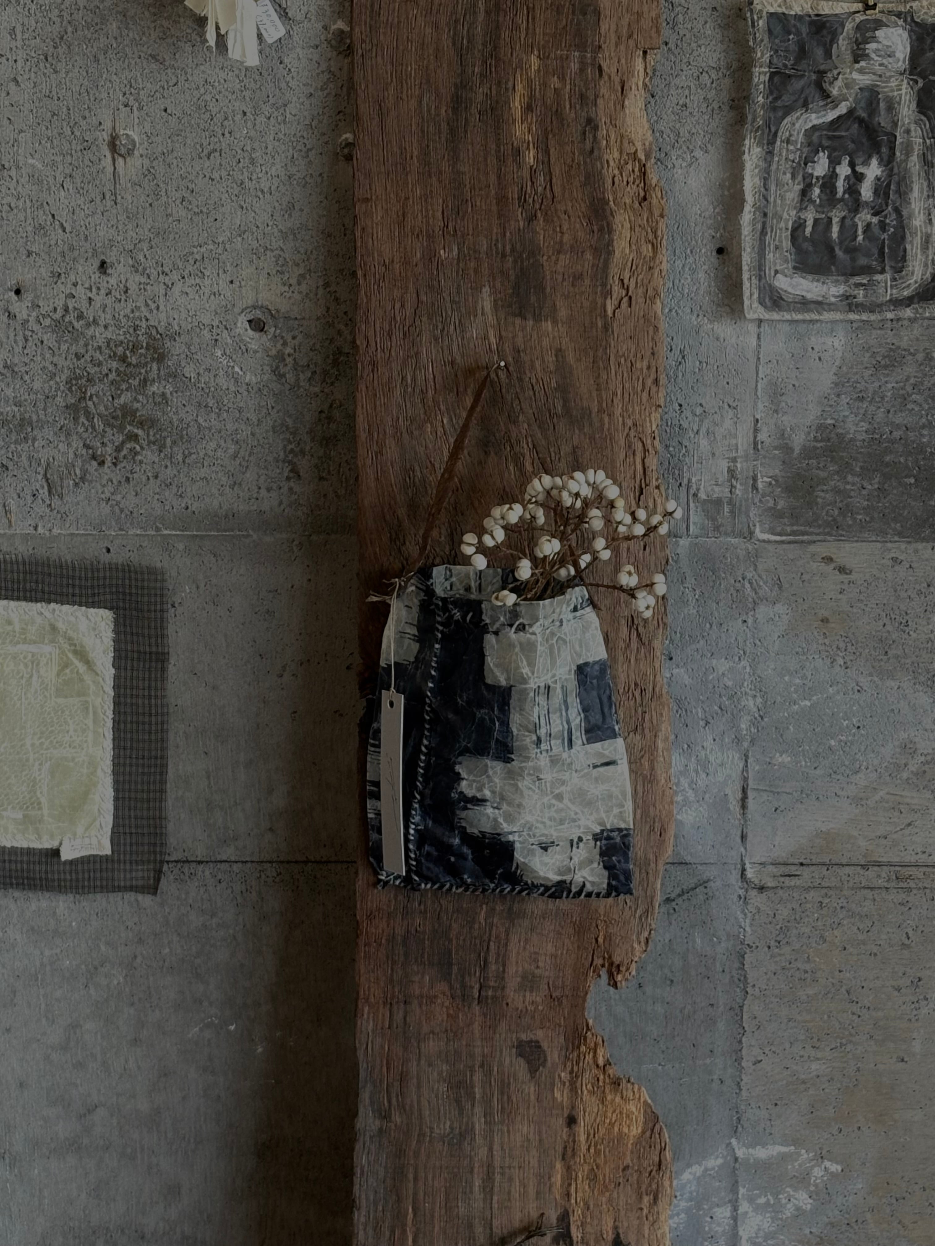 布を藍染し、蝋付けが施されたバッグです。手縫いの糸の動きも味わいがあります。持ち手はアカメガシワの木をあしらい、壁にかけると絵になります。届いたお手紙や、ドライフラワー入れに。
