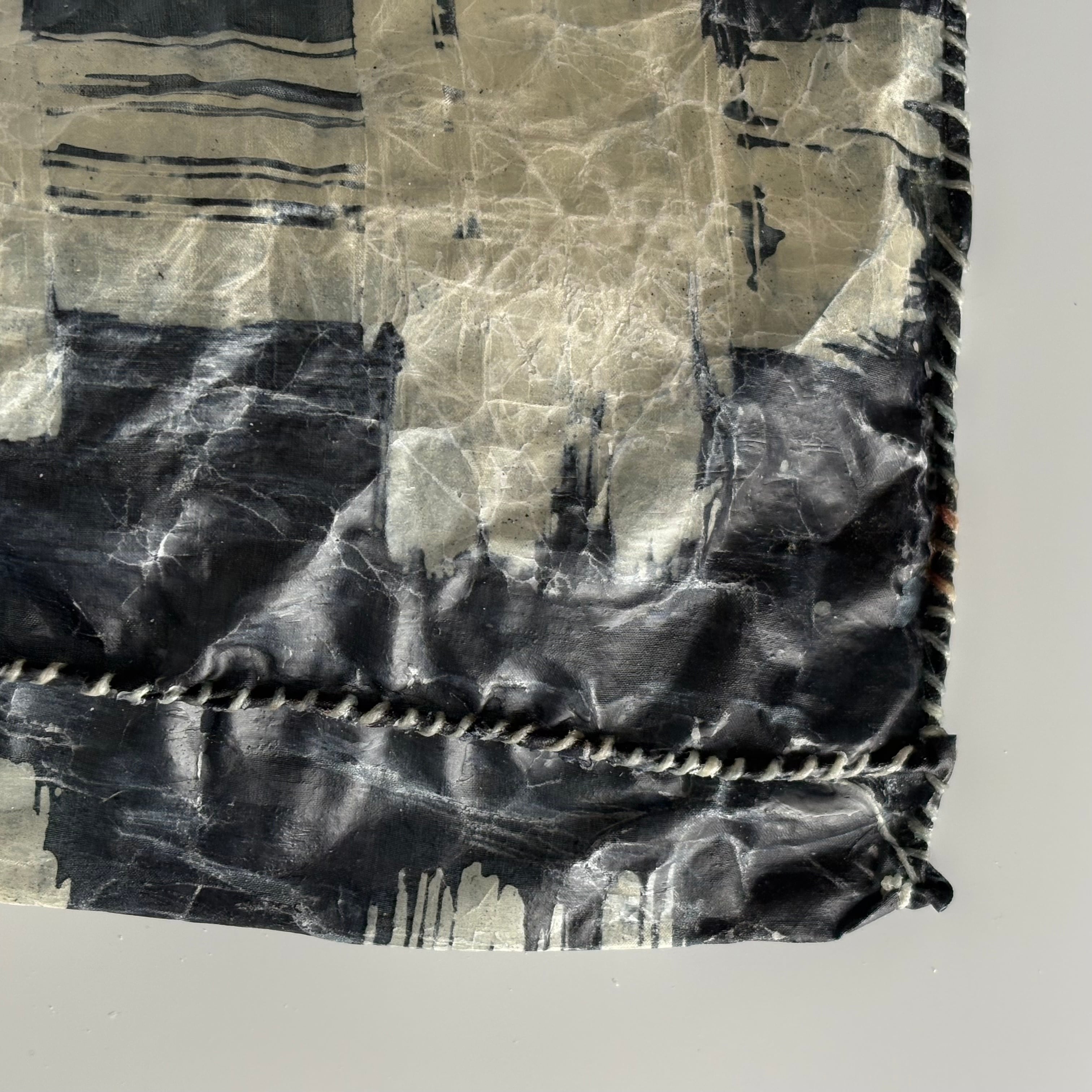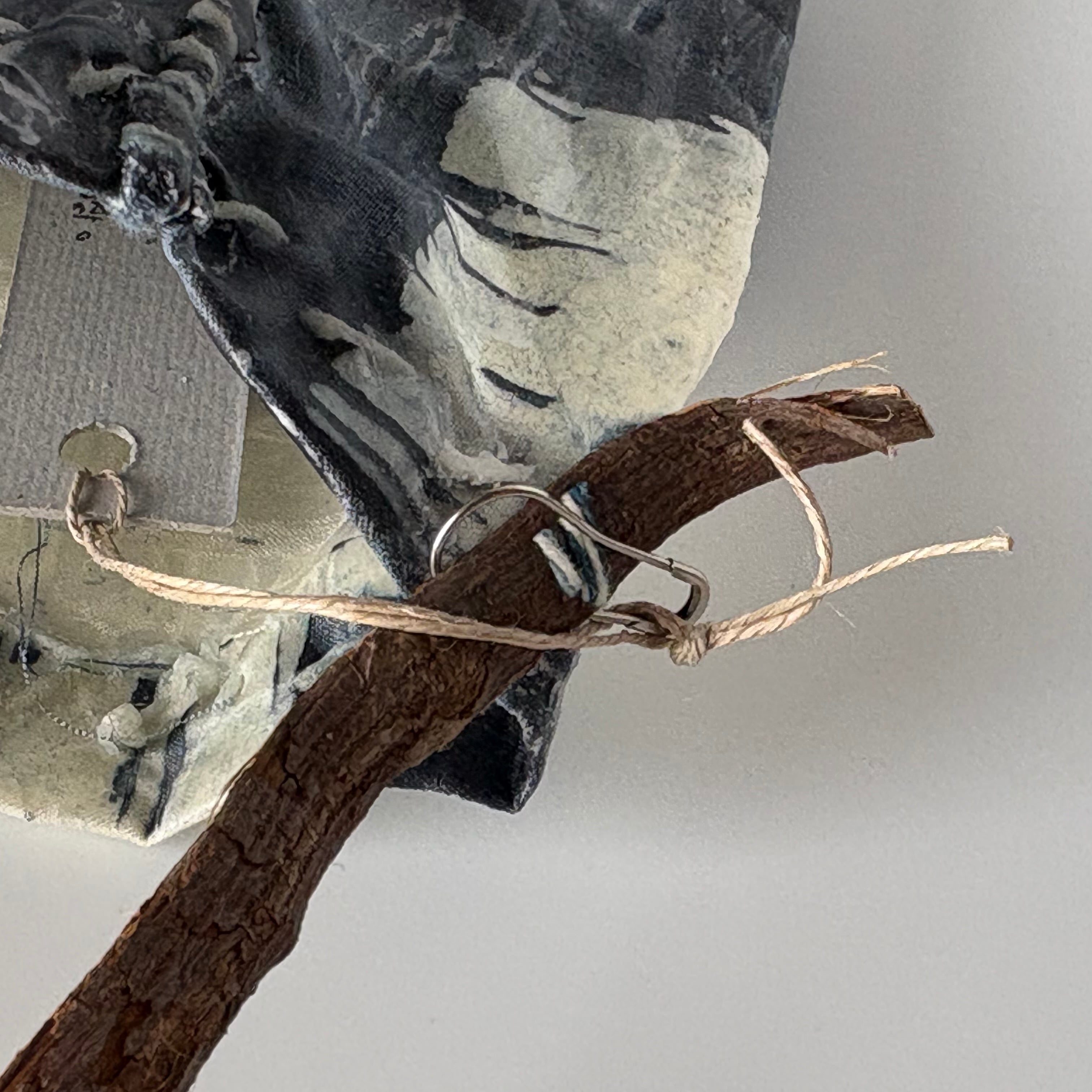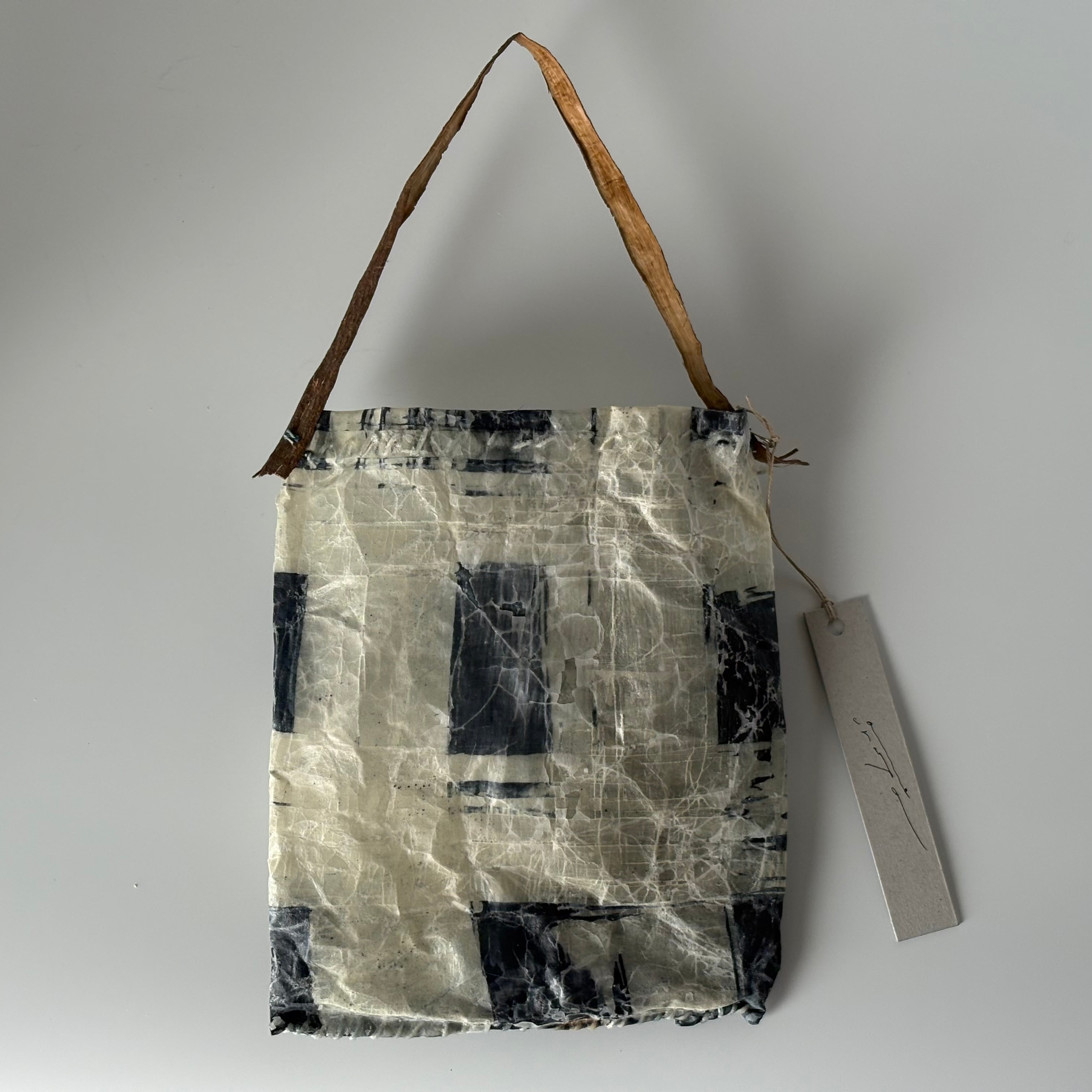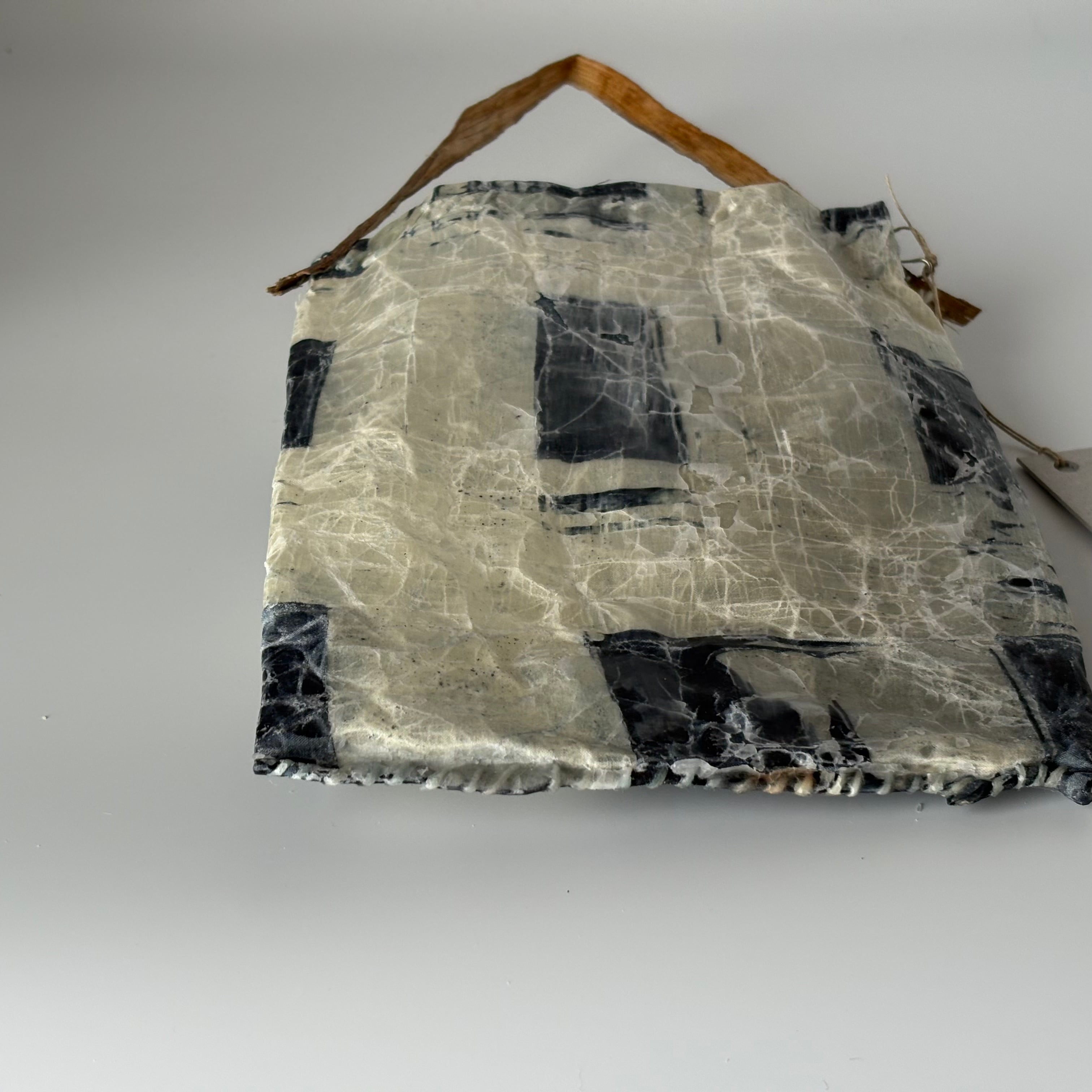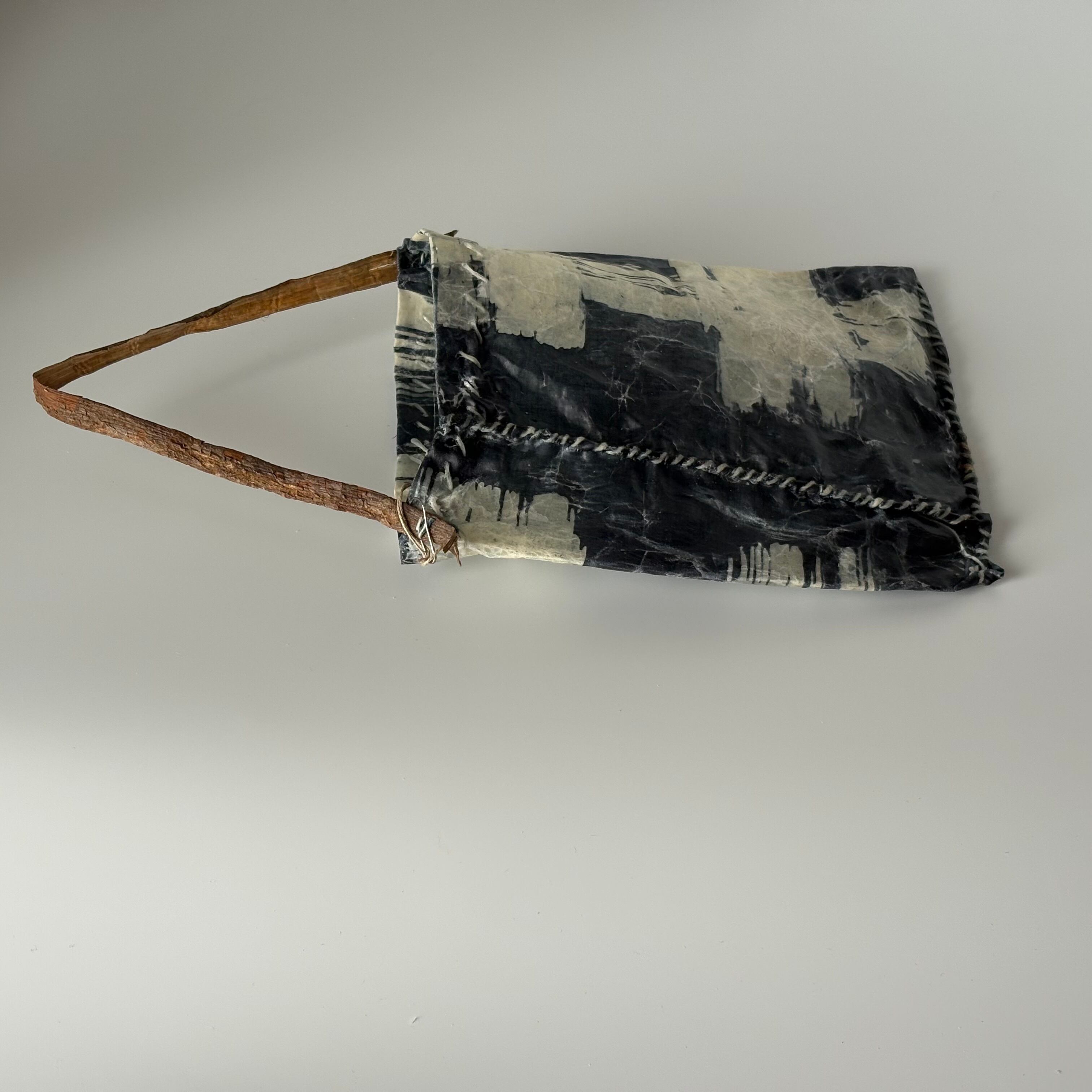 布を藍染し、蝋付けが施されたバッグです。手縫いの糸の動きも味わいがあります。持ち手はアカメガシワの木をあしらい、壁にかけると絵になります。届いたお手紙や、ドライフラワー入れに。