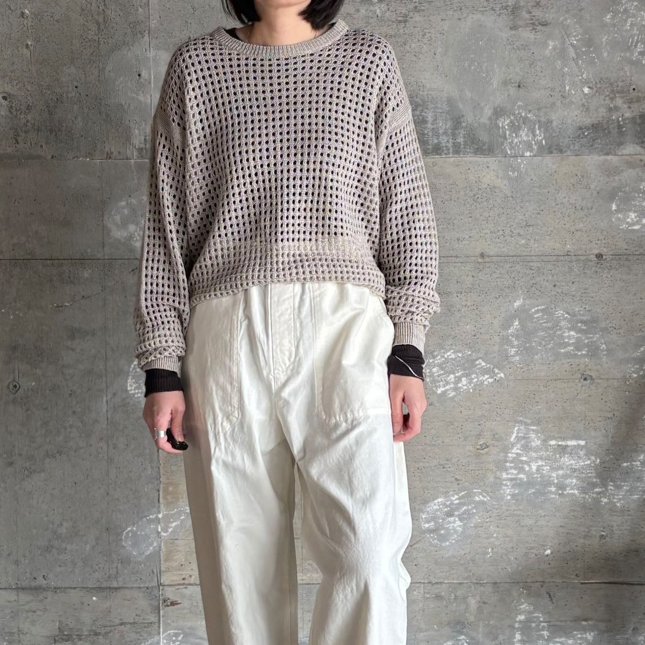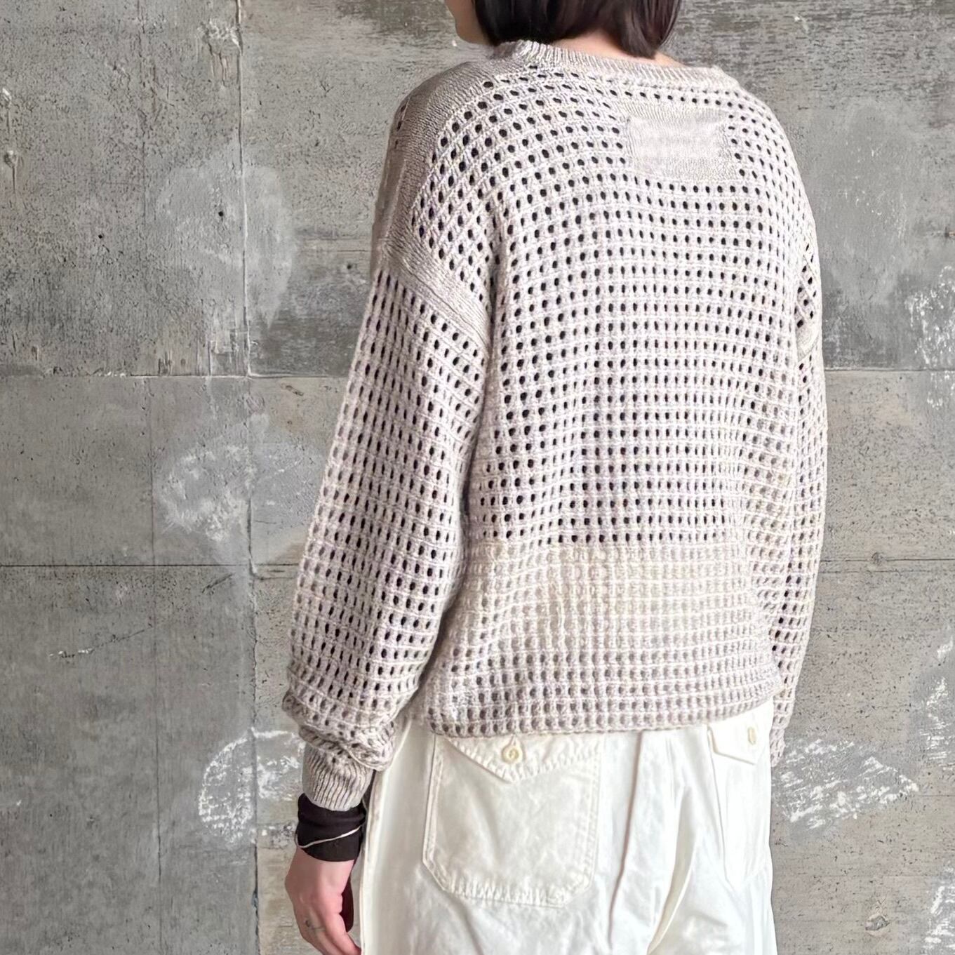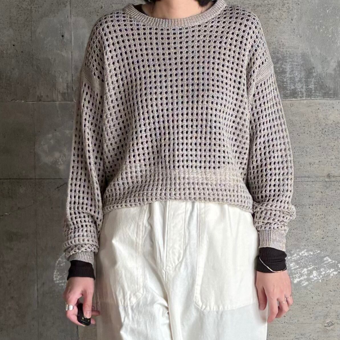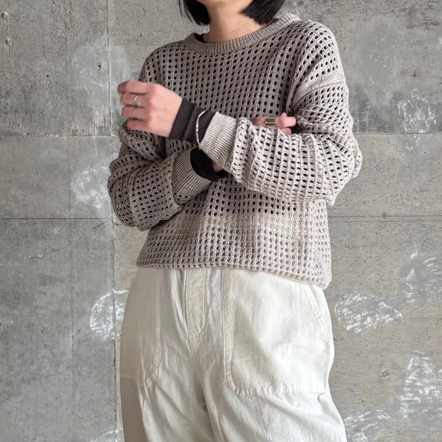 シャリ感があり、肌に触れると清涼感を感じます。メッシュ編の透けが、こなれ感を演出してくれます。春はカットソー合わせ、夏はタンクトップで、それぞれの季節で着こなしが楽しめます。中の色を変えていただくと、コーディネートの幅が広がります。