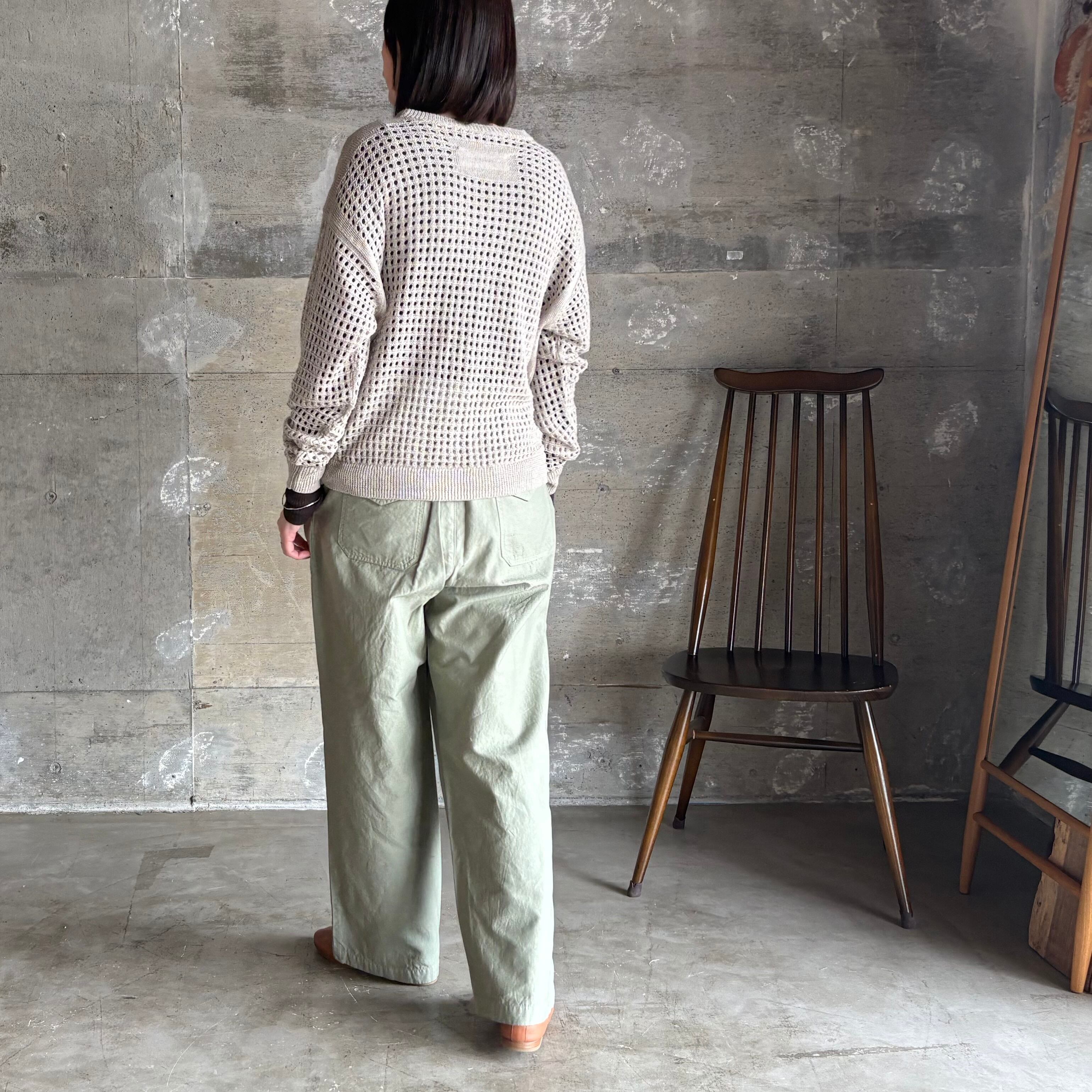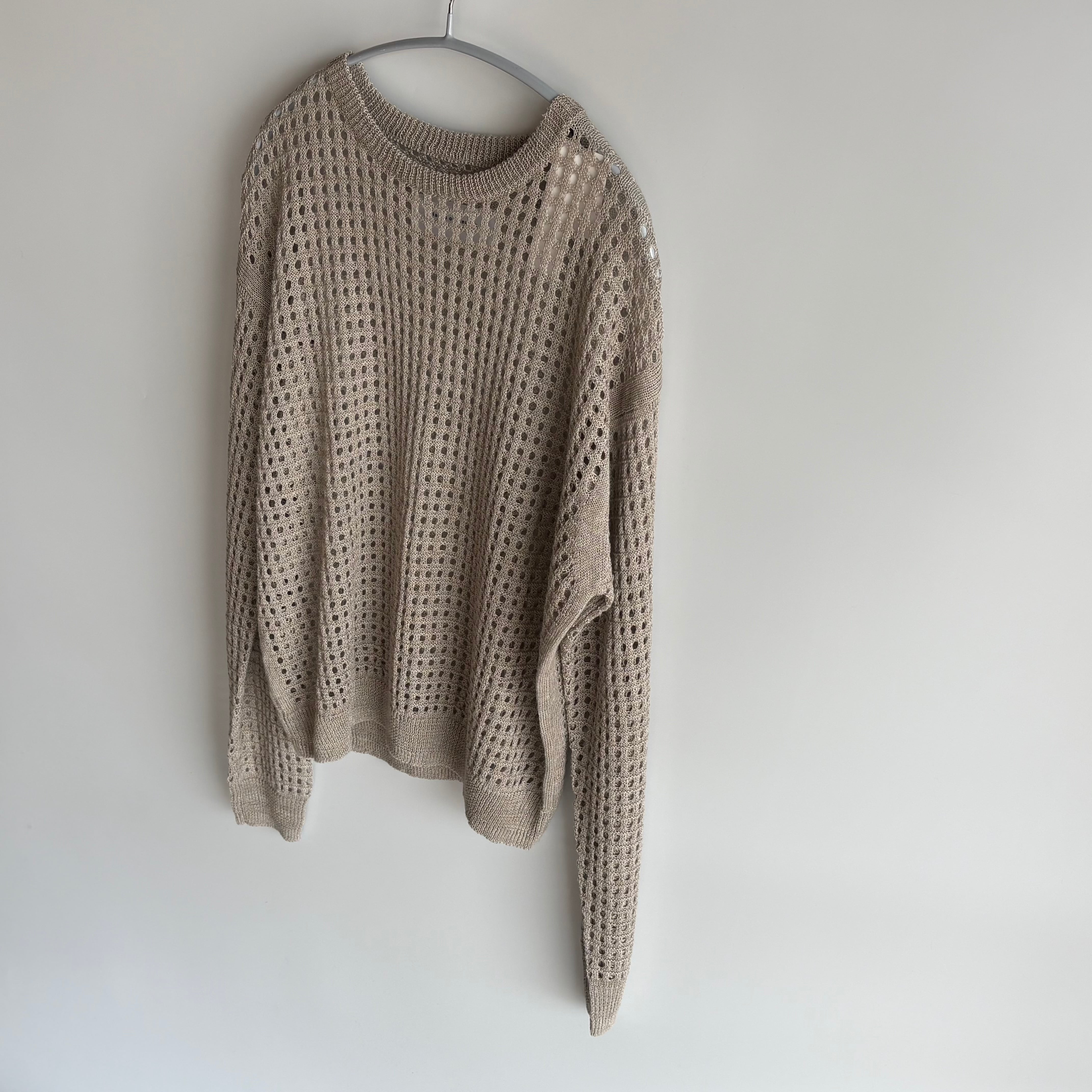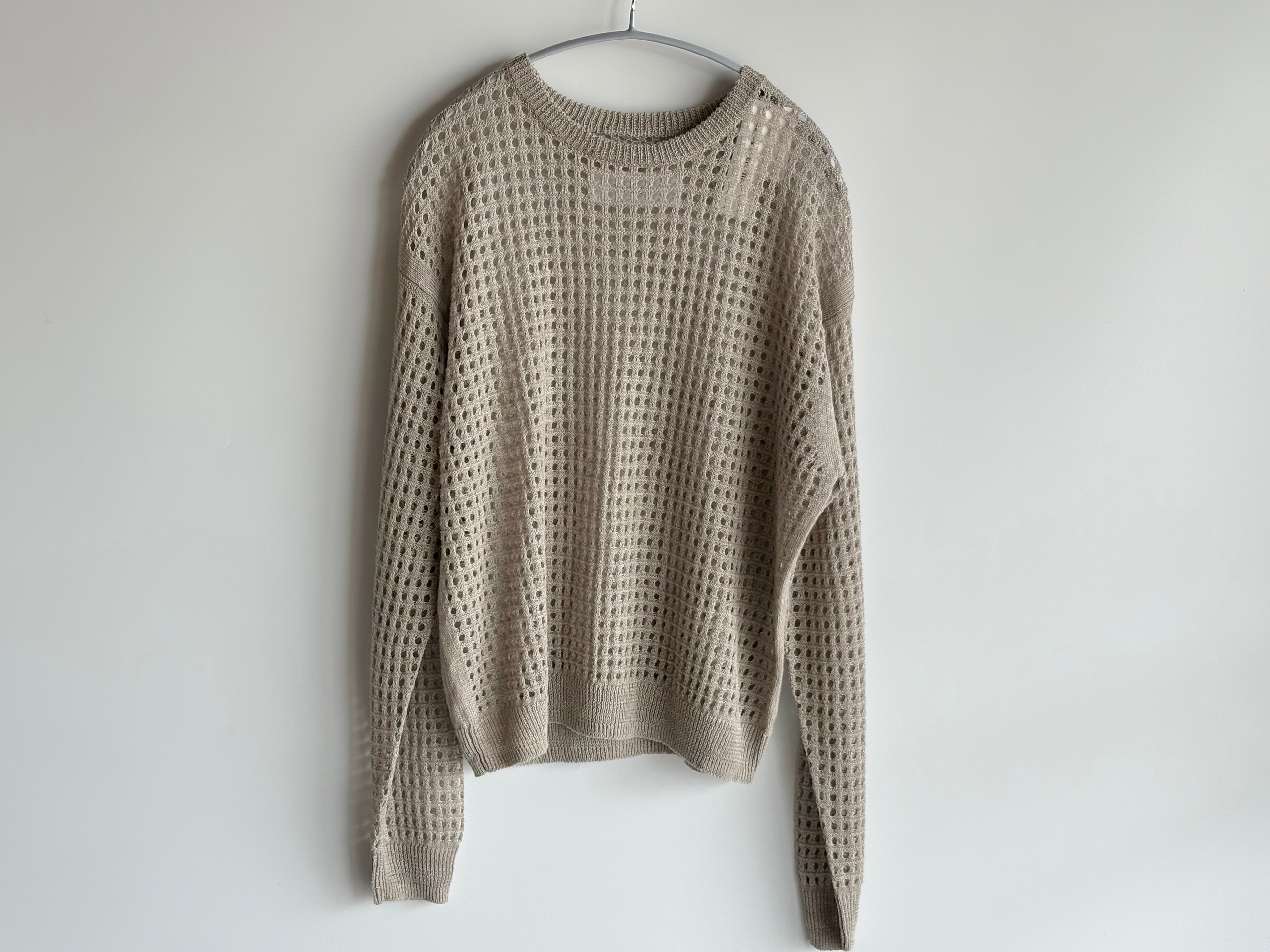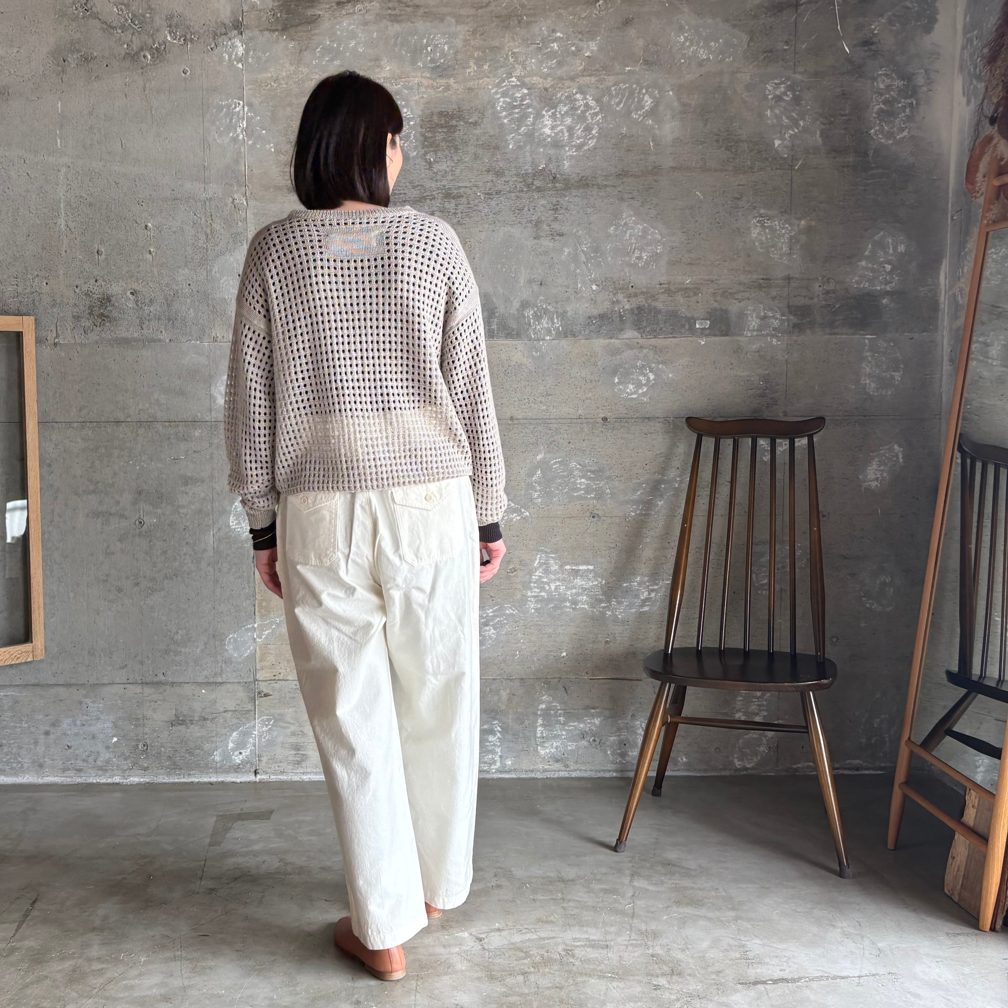 シャリ感があり、肌に触れると清涼感を感じます。メッシュ編の透けが、こなれ感を演出してくれます。春はカットソー合わせ、夏はタンクトップで、それぞれの季節で着こなしが楽しめます。中の色を変えていただくと、コーディネートの幅が広がります。