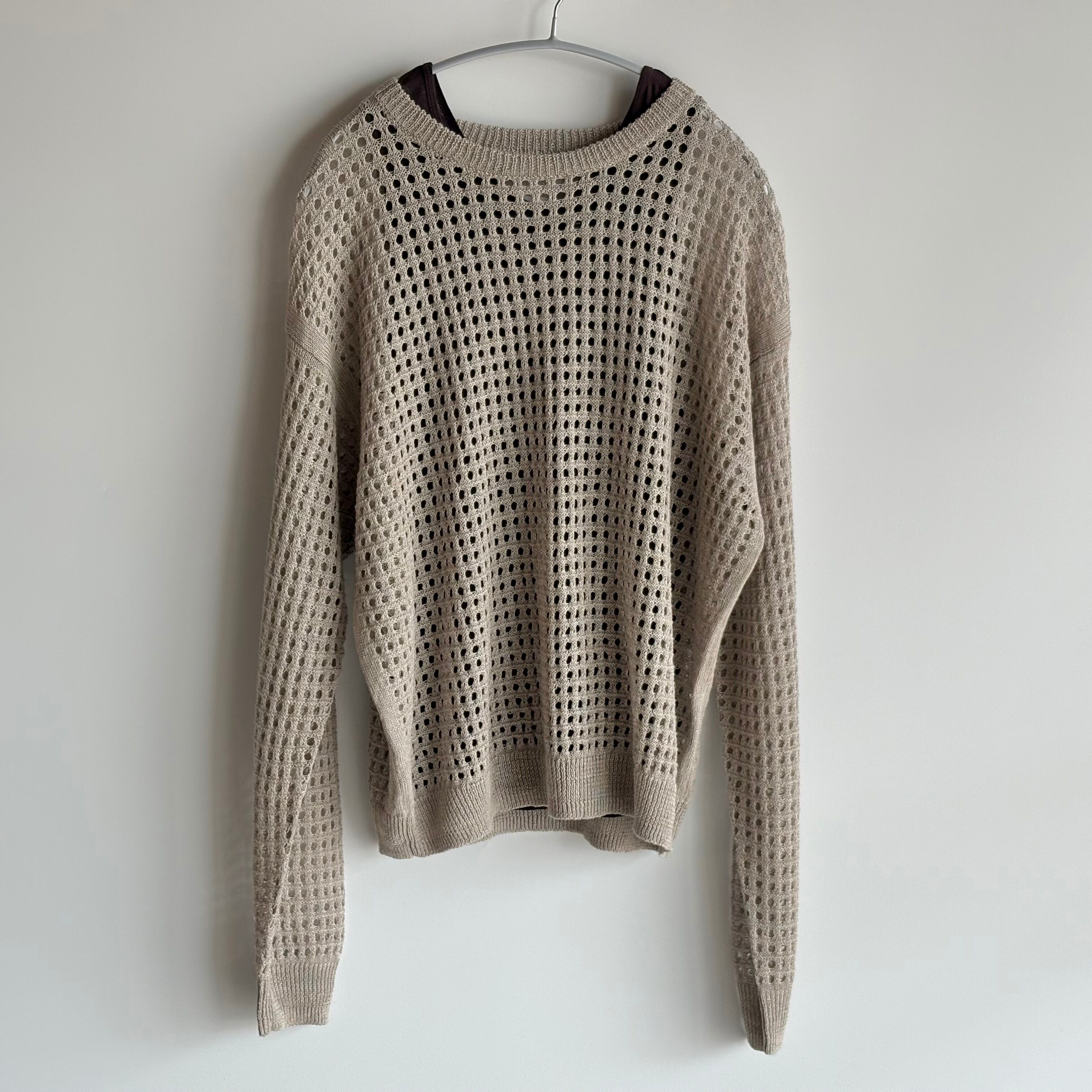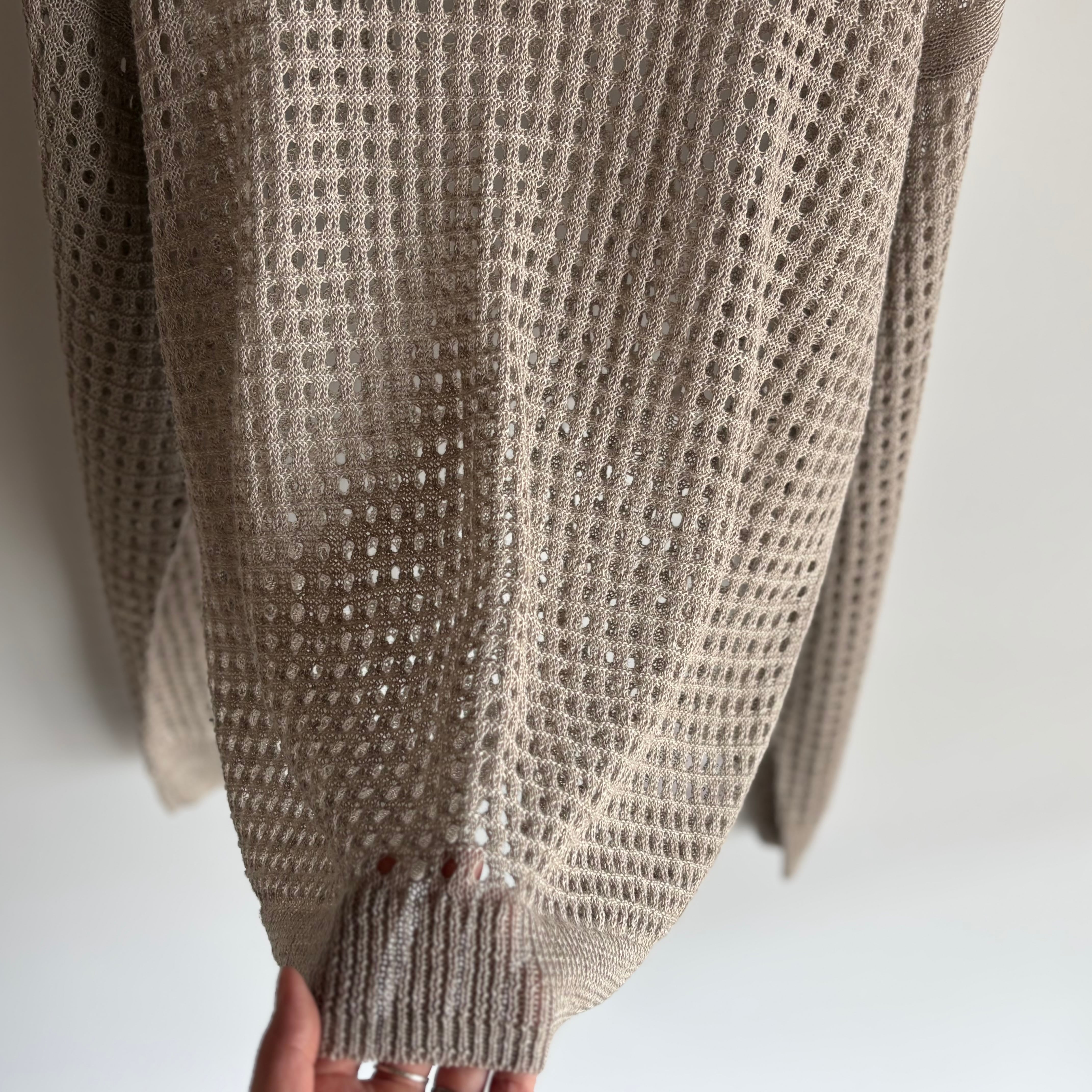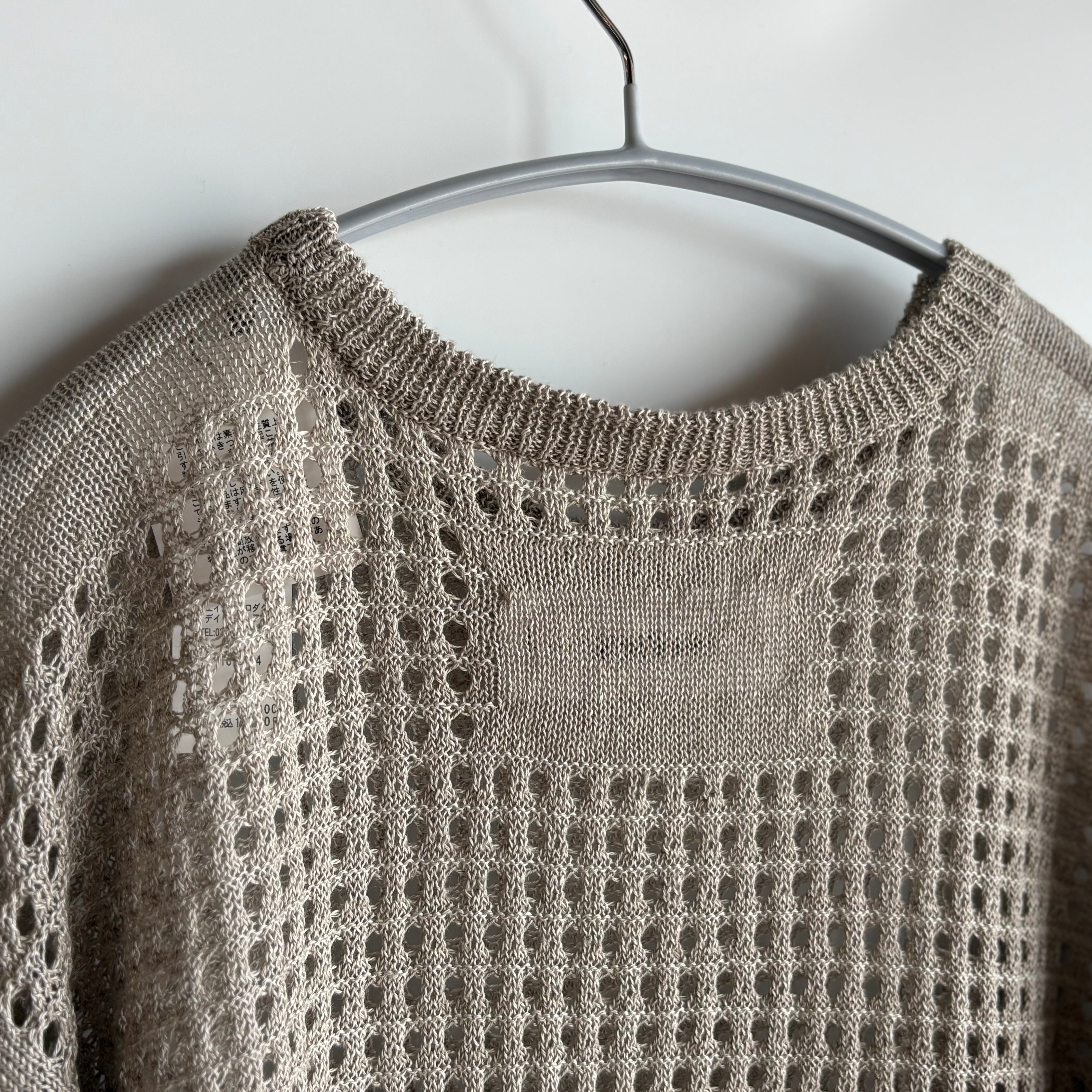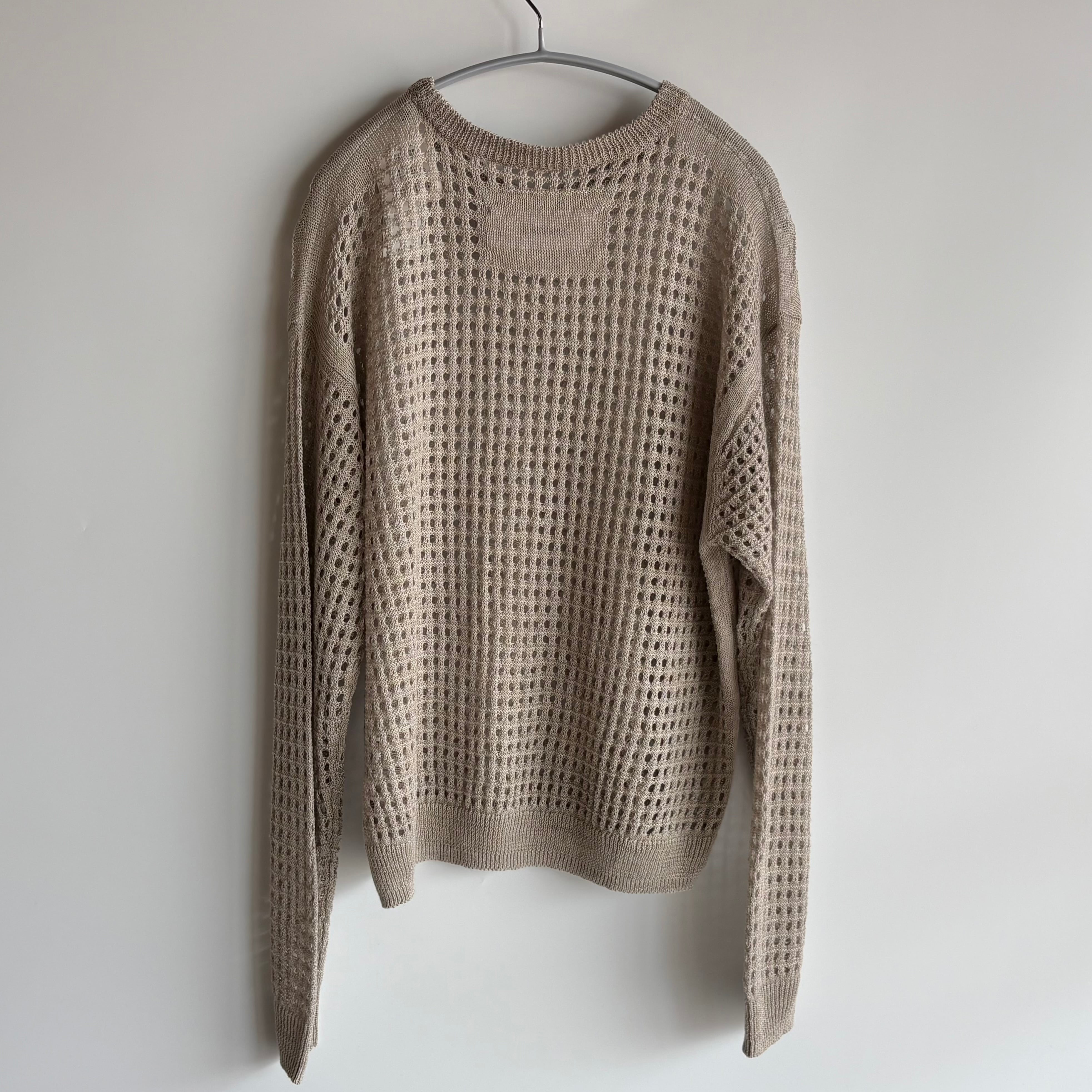 シャリ感があり、肌に触れると清涼感を感じます。メッシュ編の透けが、こなれ感を演出してくれます。春はカットソー合わせ、夏はタンクトップで、それぞれの季節で着こなしが楽しめます。中の色を変えていただくと、コーディネートの幅が広がります。