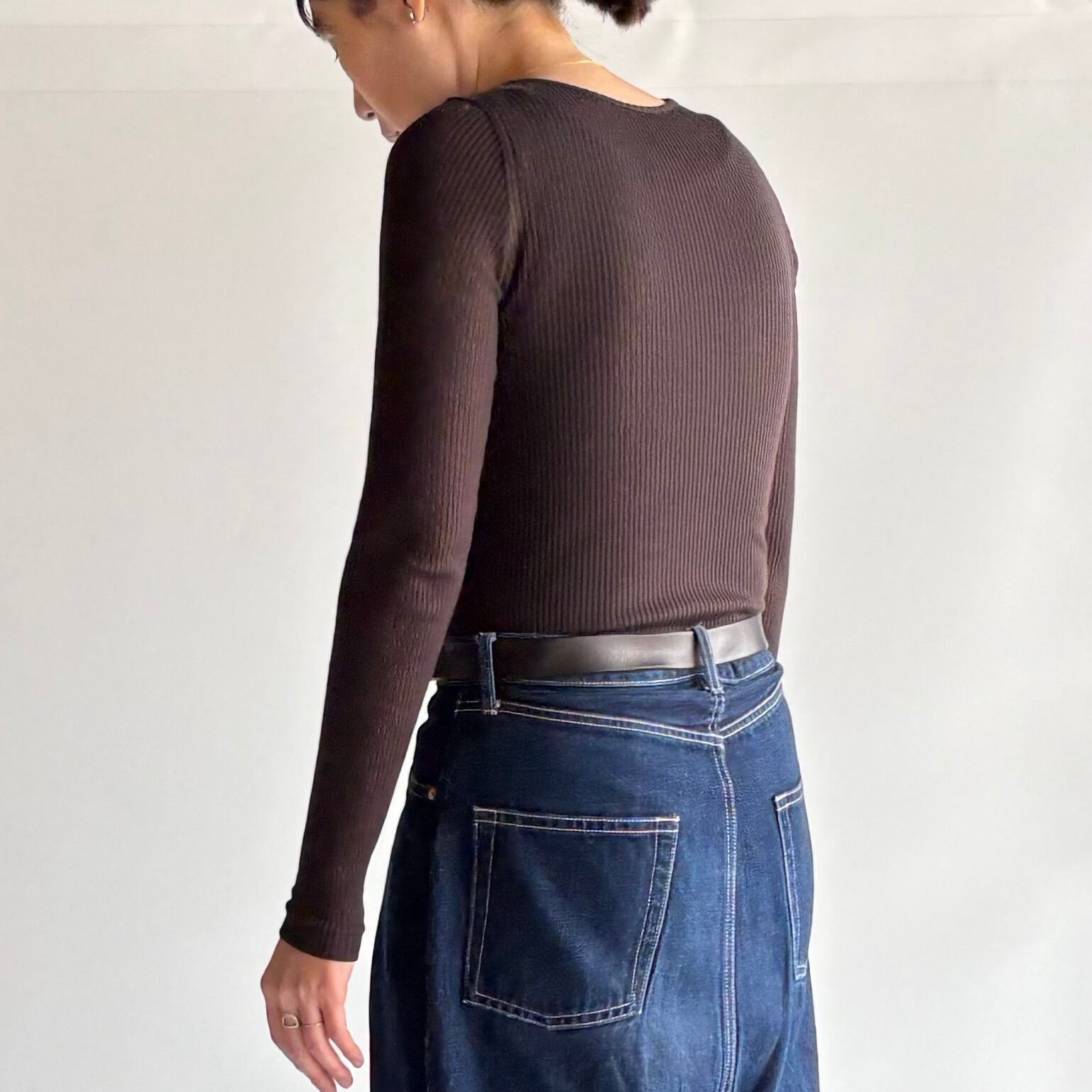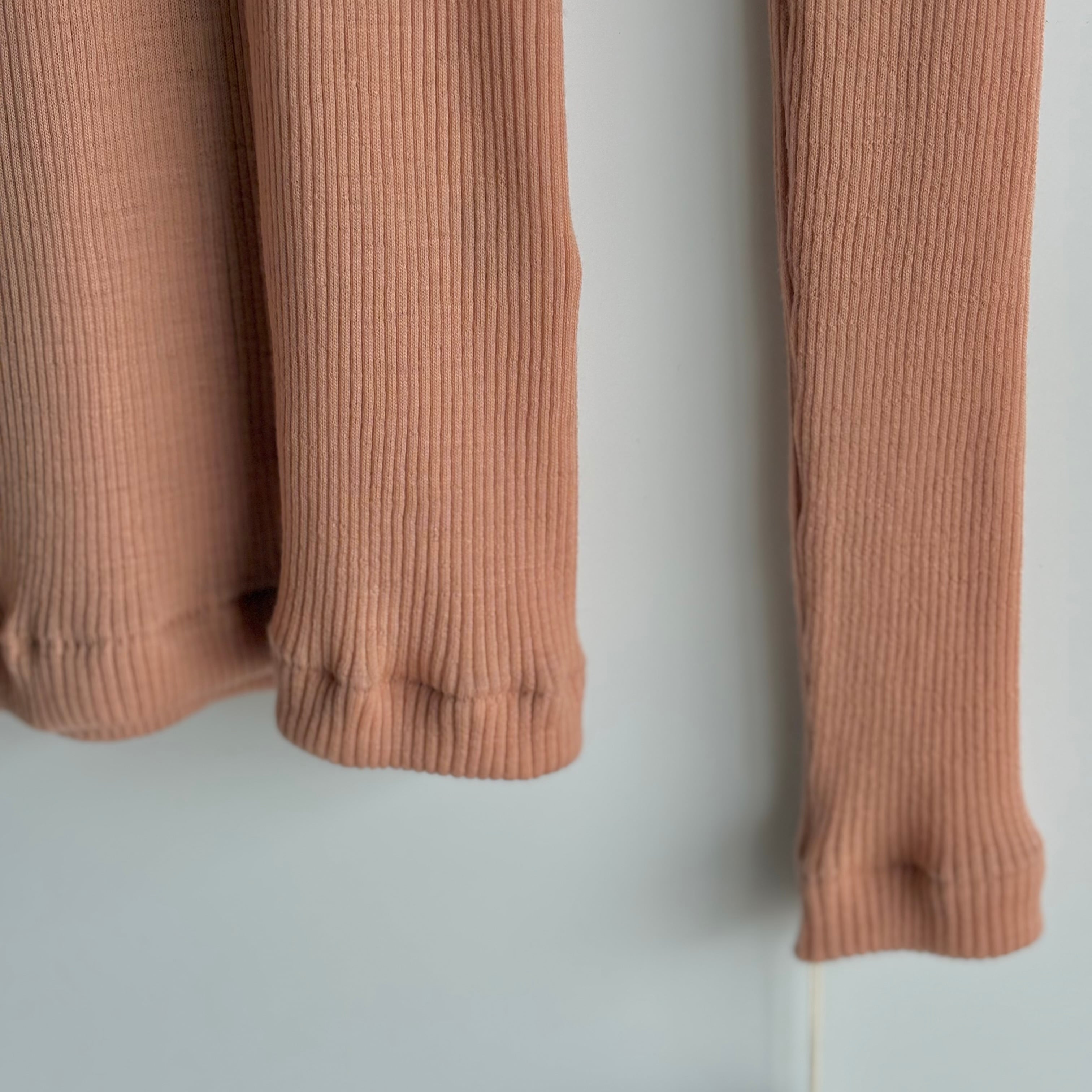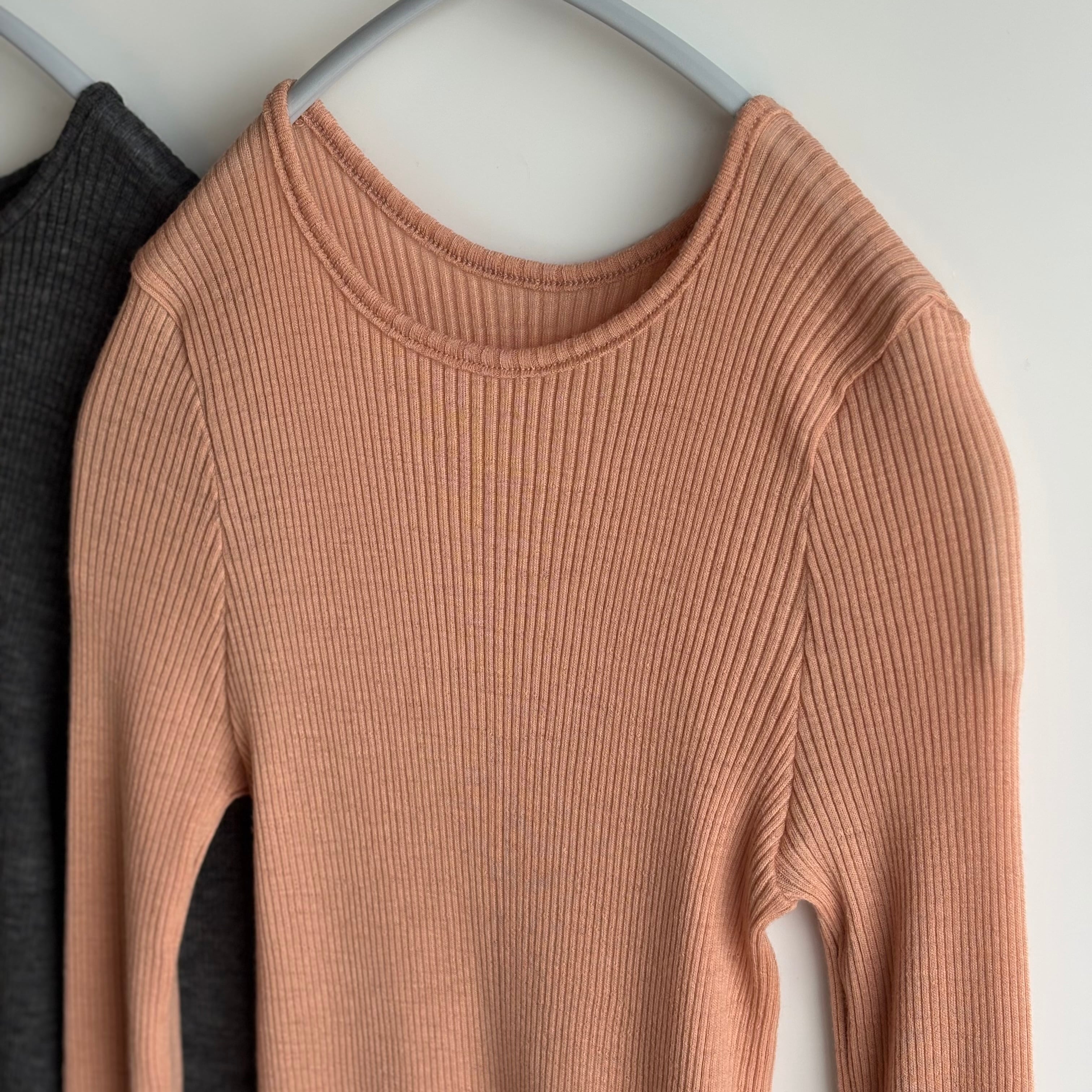 ウール100%の柔らかいリブカットソー。ニュージーランドの雄大な自然で育ったメリノ羊のウール100%で作られています。チクチク感がなく、ふわっと、とても柔らかい肌さわりで心地よい1枚です。
