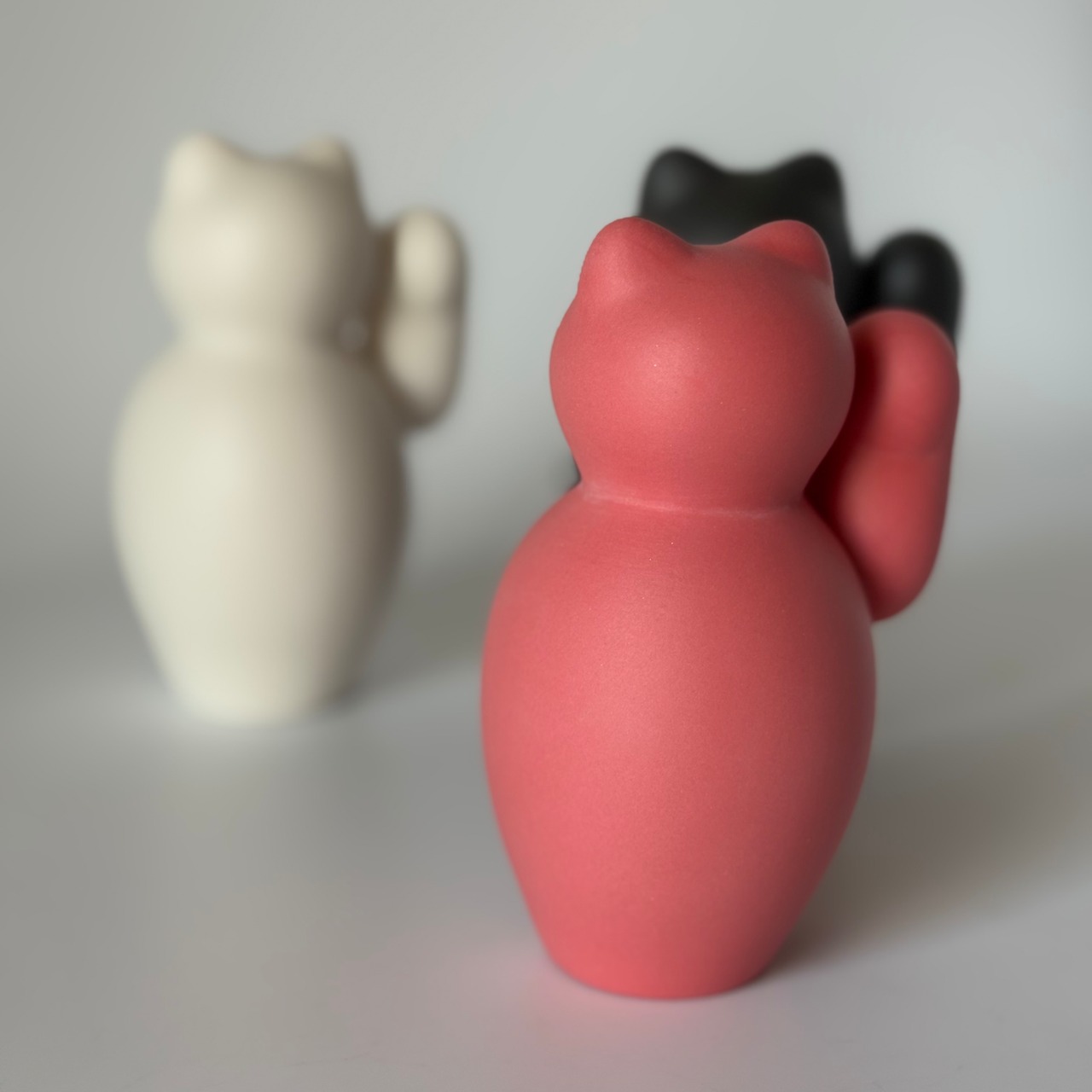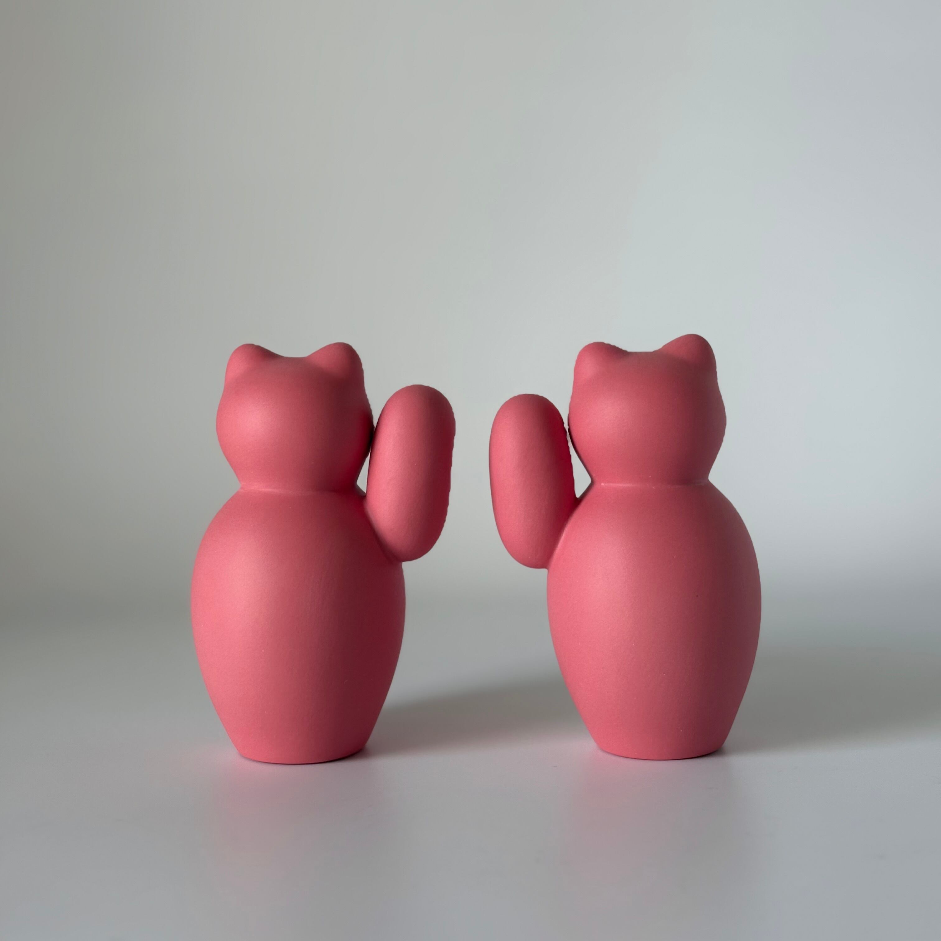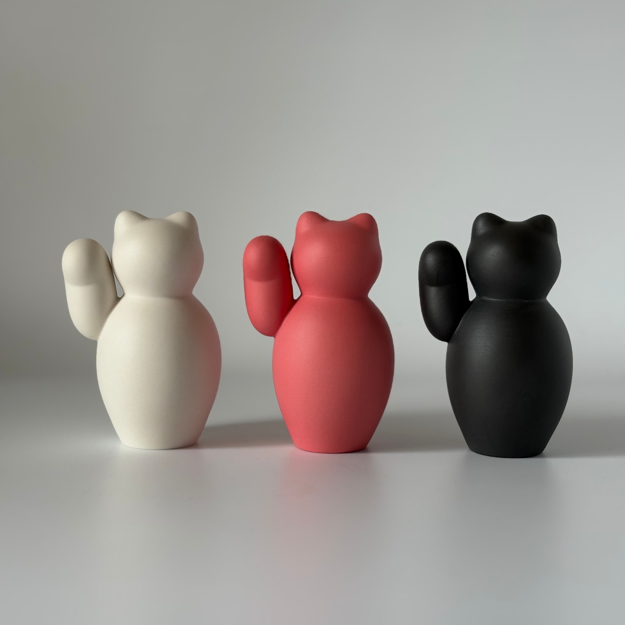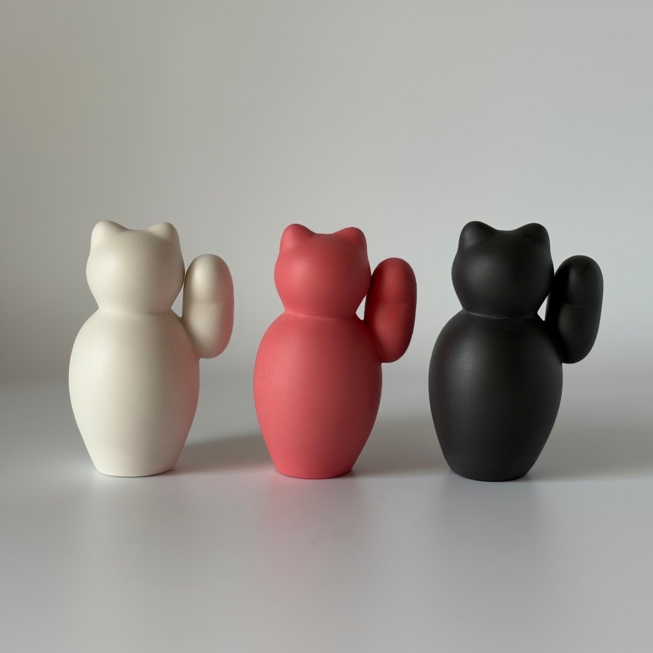ころんとした形が愛らしい、磁器のまねきねこ。右手はお金を招く、左手は人を招くと言われています。