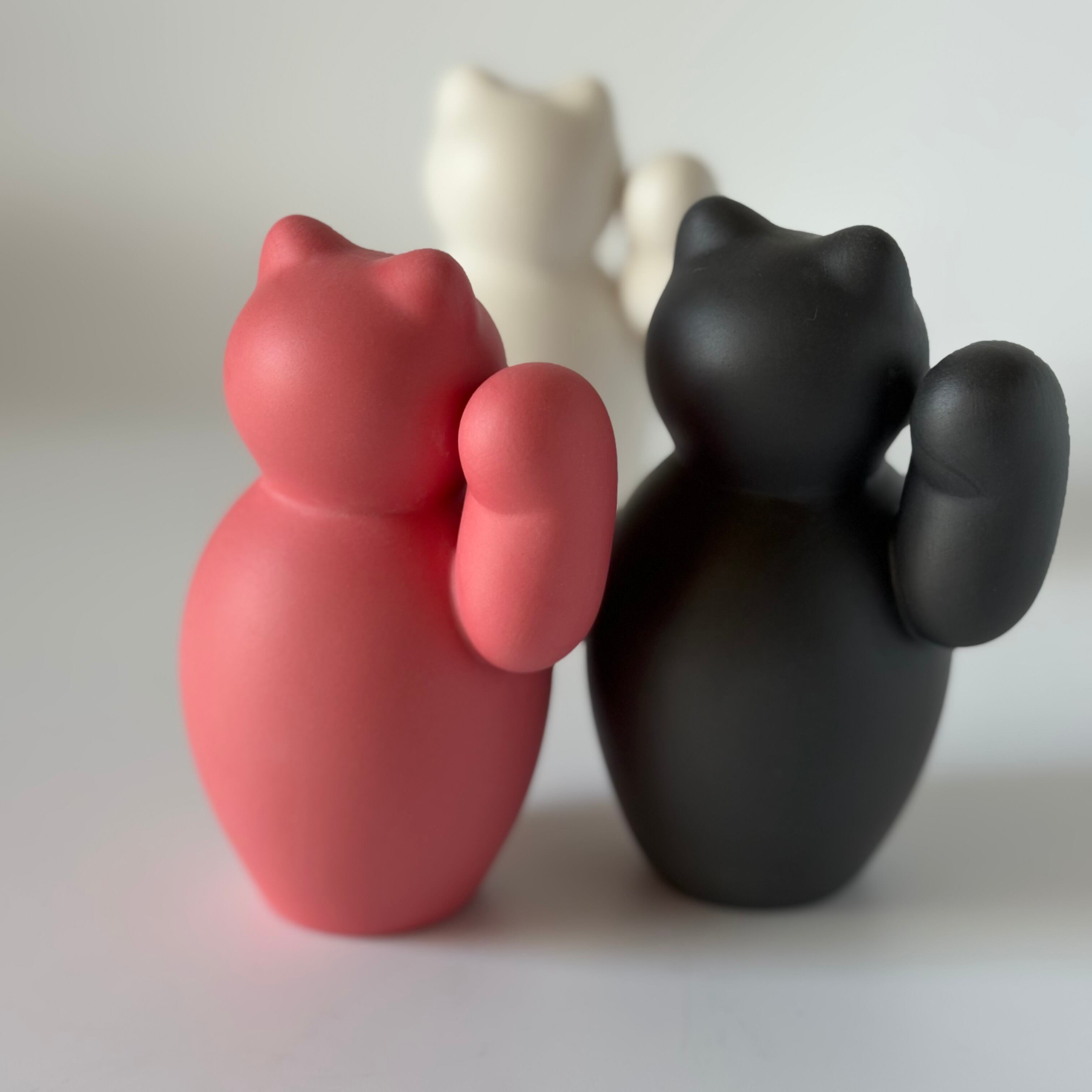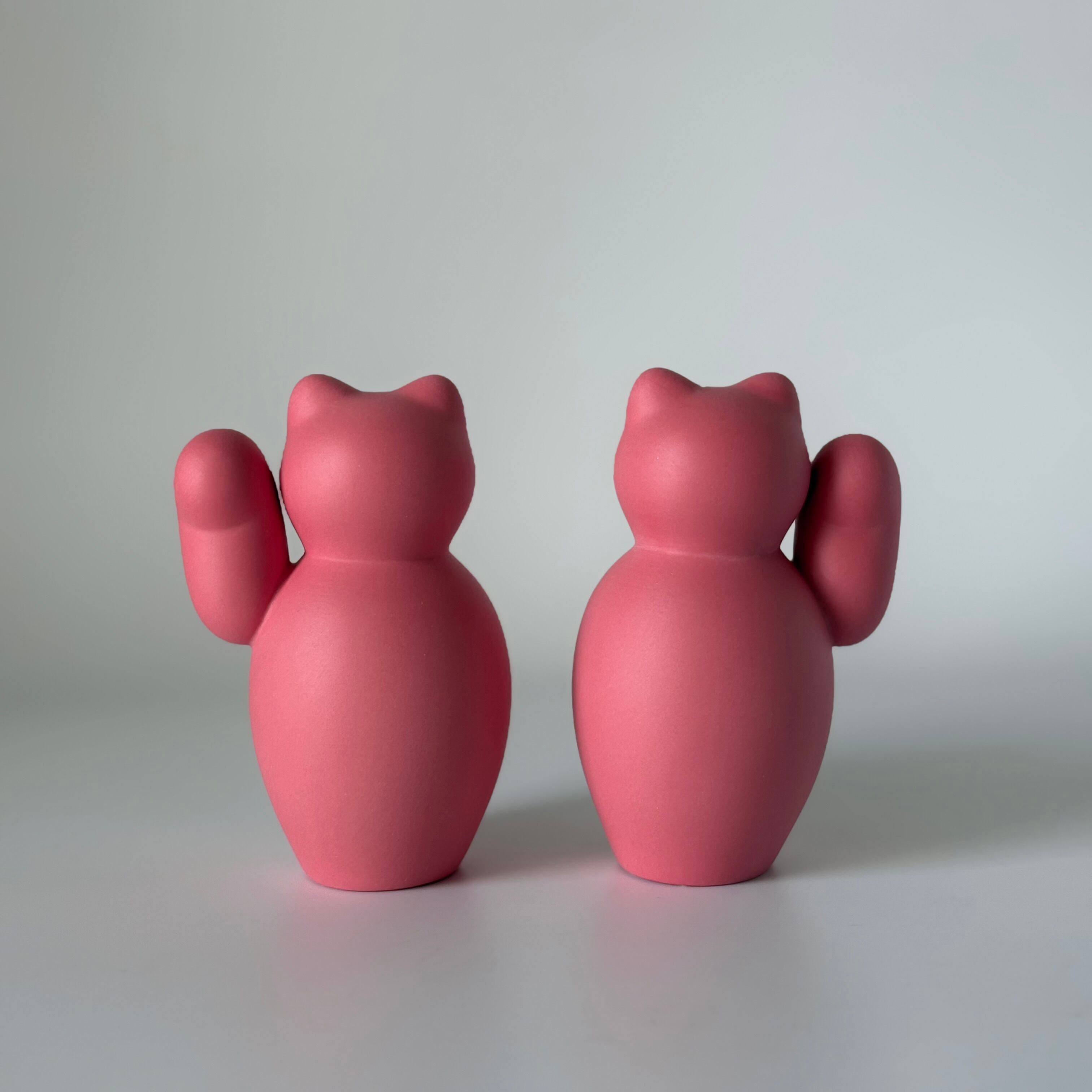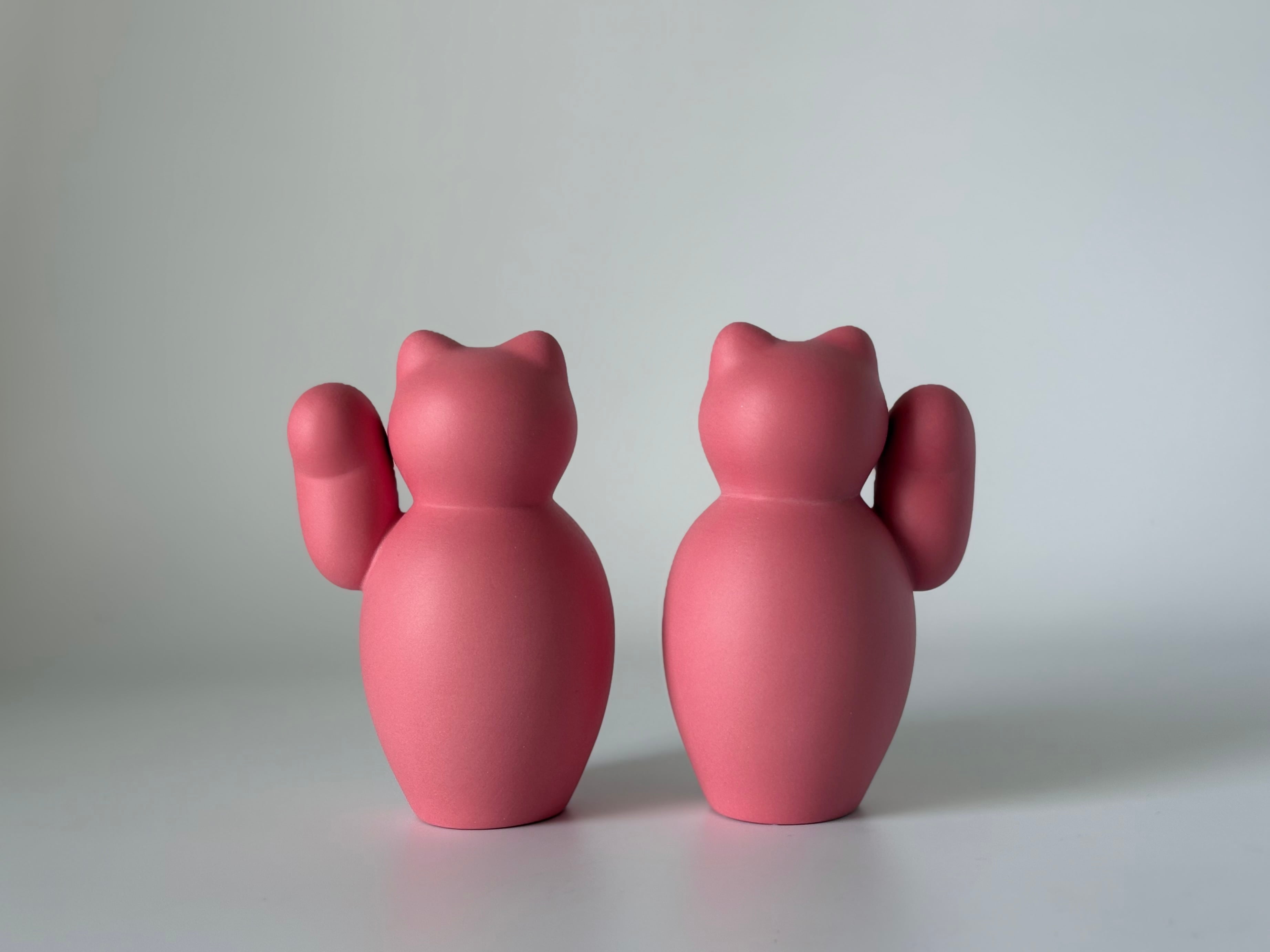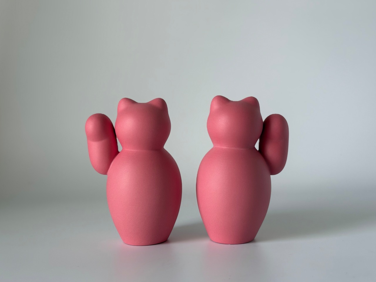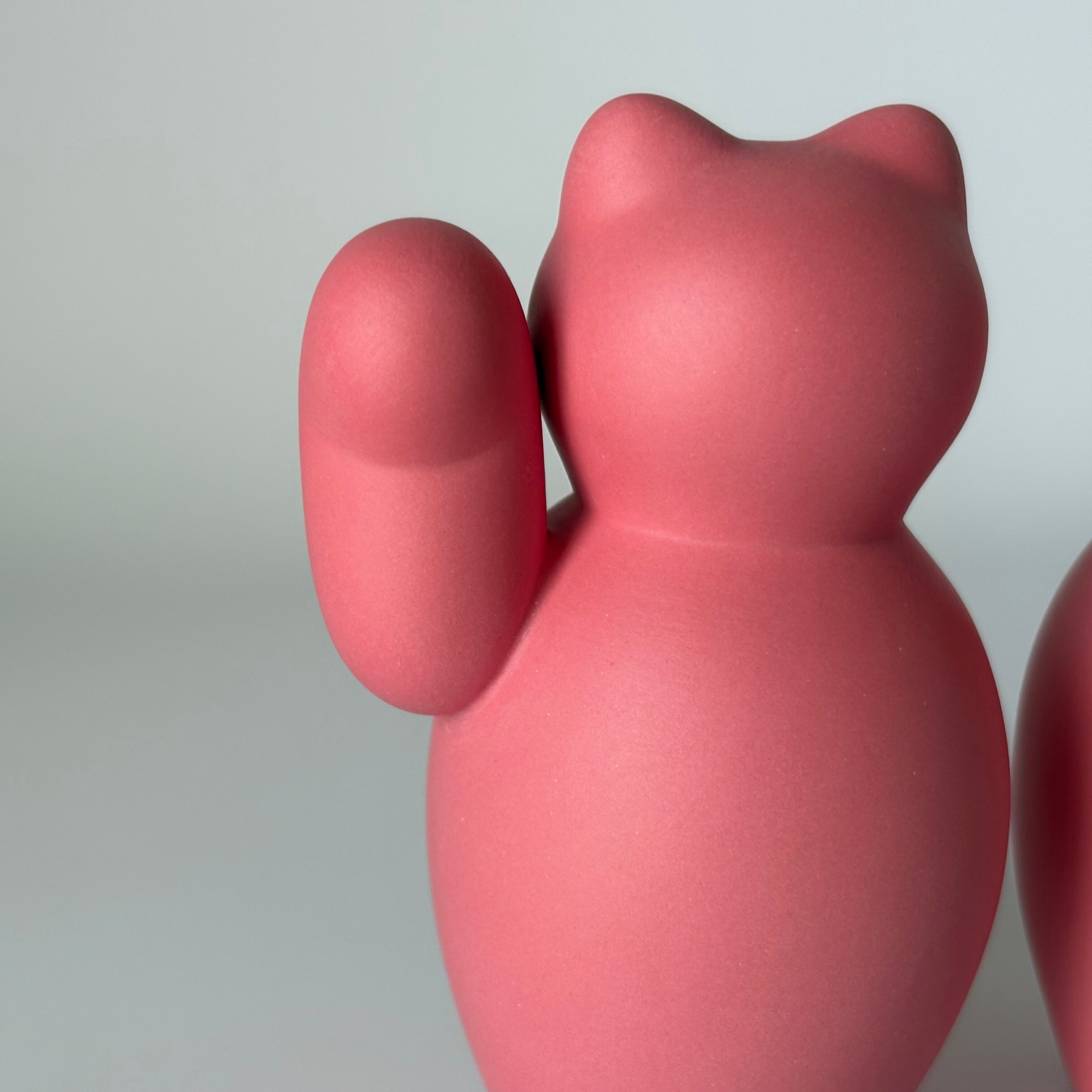 ころんとした形が愛らしい、磁器のまねきねこ。右手はお金を招く、左手は人を招くと言われています。