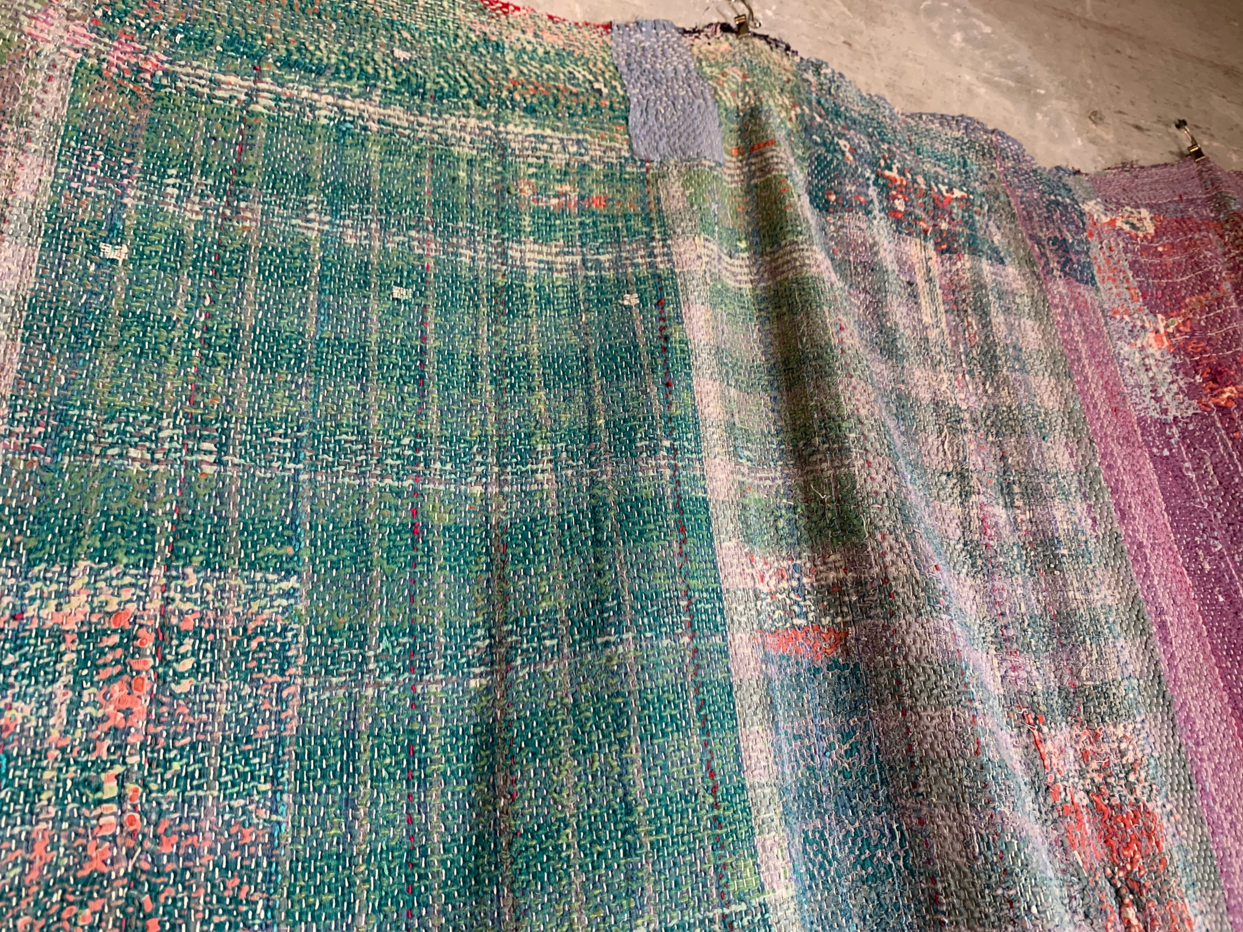 インドの民族衣装サリーや古くなった布を数枚縫い合わせ、全て一針、一針手作業で縫われています。