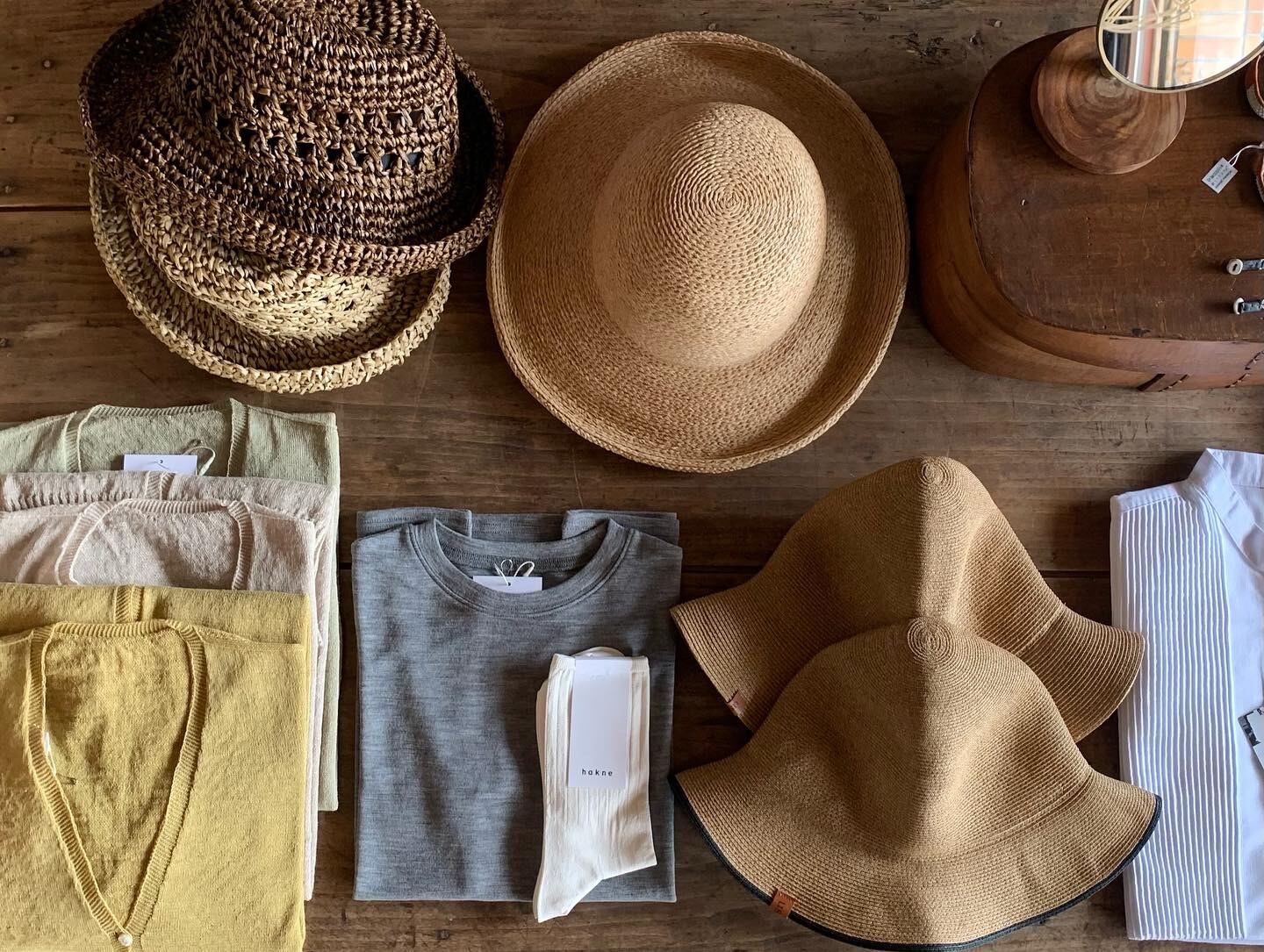つばの周りに紐がついていますので、引っ張るとアレンジで形がつくれます。シャリっとした質感、柔らかくカバンに入れて持ち運びも◎