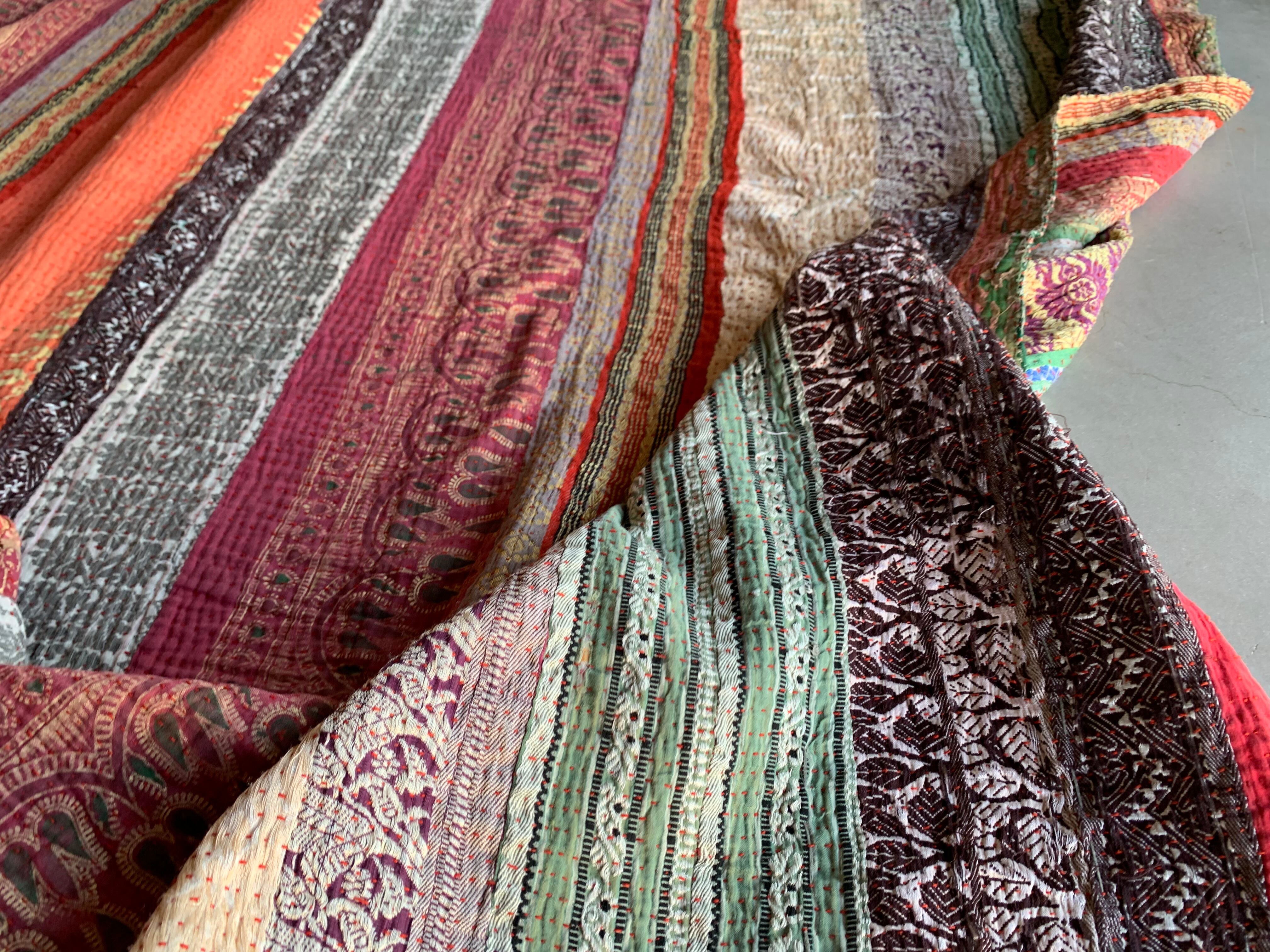 インドの民族衣装サリーや古くなった布を数枚縫い合わせ、全て一針、一針手作業で縫われています。