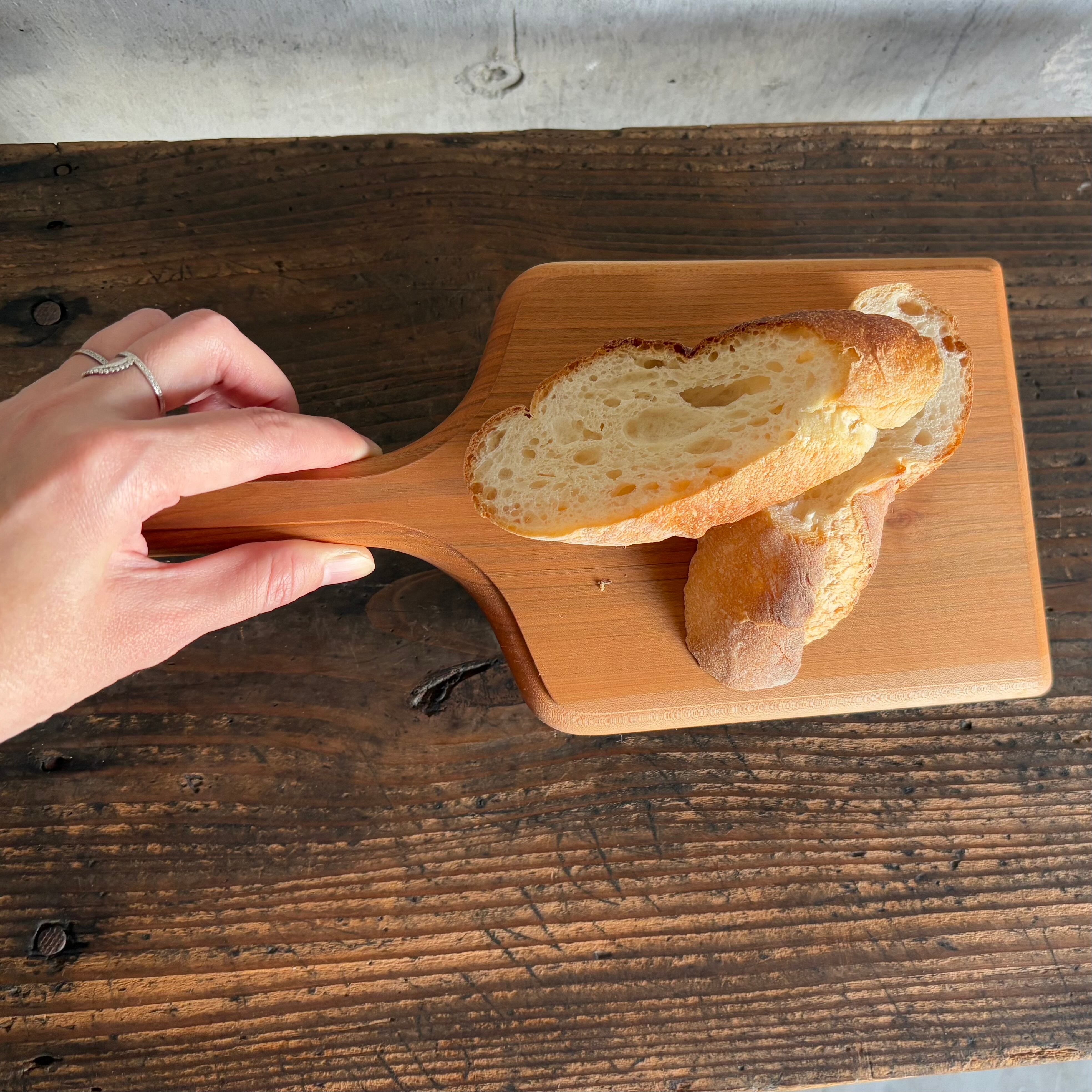※カッティングボードはギザギザの刃がついたブレッドナイフでも傷つきにくいように、まな板とは違い基本固い木が使われています。まな板のようにお使いになるのと鋼やセラミックの包丁は刃こぼれの原因になりますのでご注意ください。