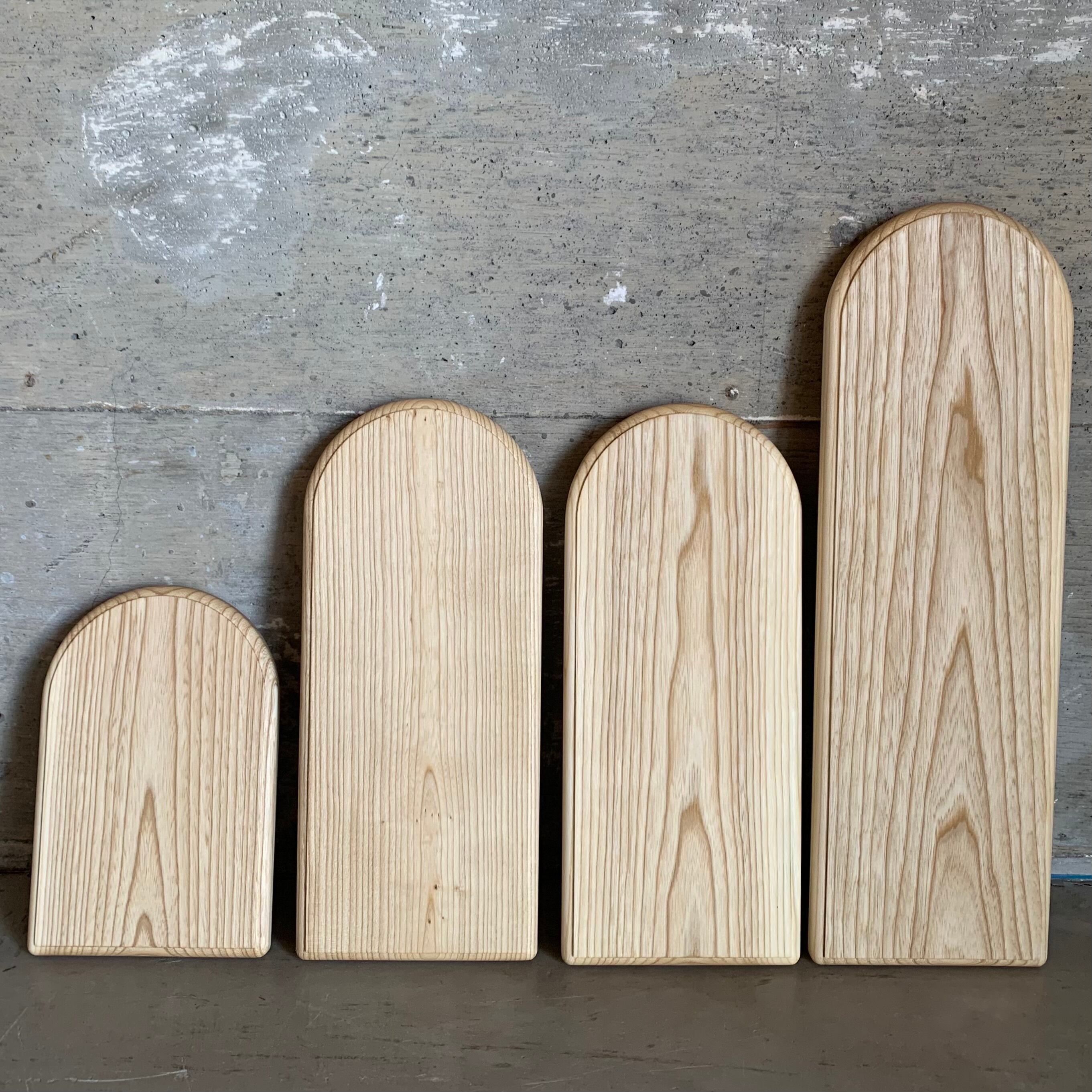 扉のような形のカッティングボード。タモはナチュラルで均一に木目が入っており滑らかな肌さわり。チーズとクラッカー、パン、果物などを切ってそのまま器としても◎立てかけると小さな扉があるように見えオブジェのように美しくキッチンを演出してくれます。