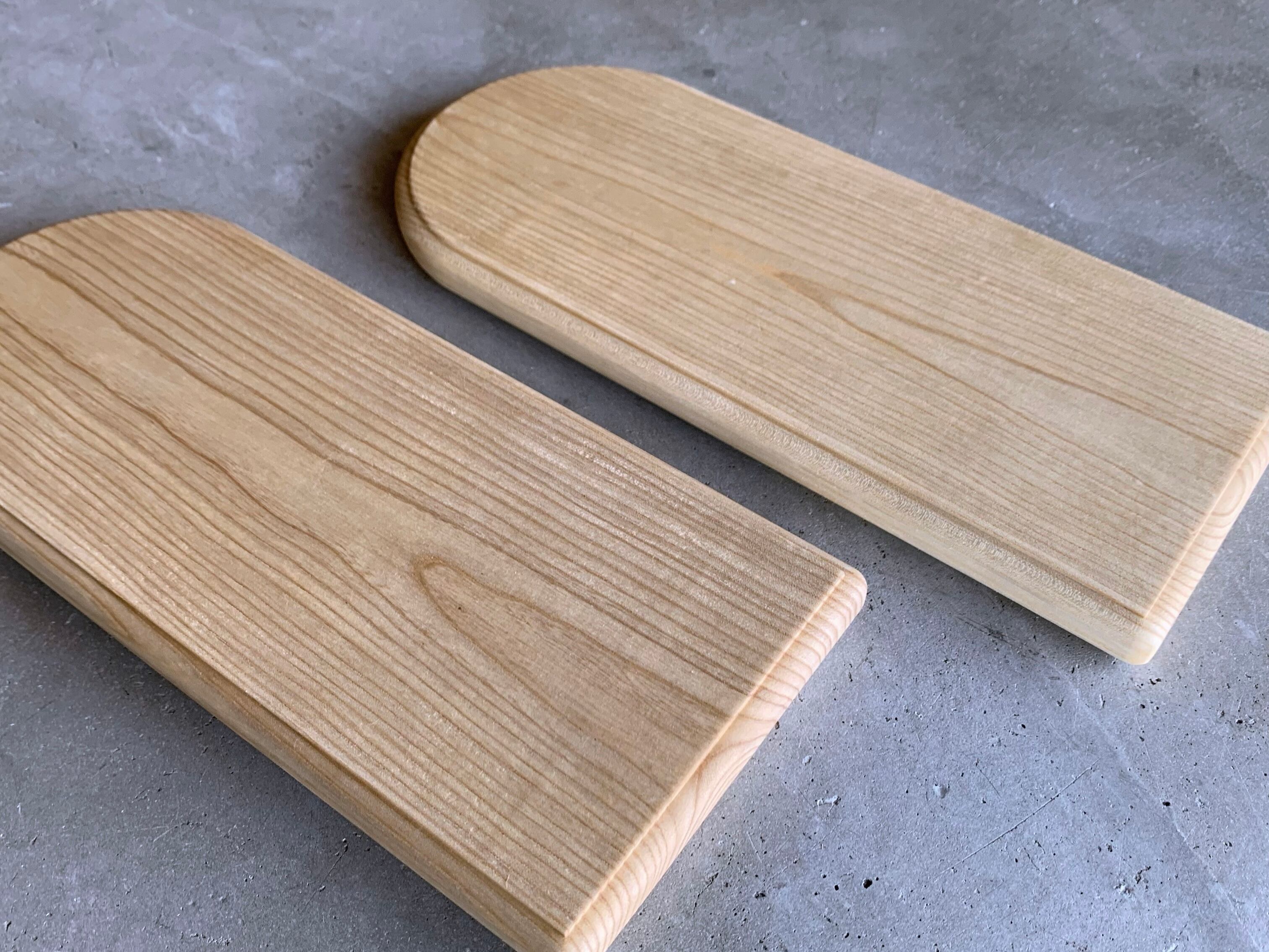 扉のような形のカッティングボード。タモはナチュラルで均一に木目が入っており滑らかな肌さわり。チーズとクラッカー、パン、果物などを切ってそのまま器としても◎立てかけると小さな扉があるように見えオブジェのように美しくキッチンを演出してくれます。