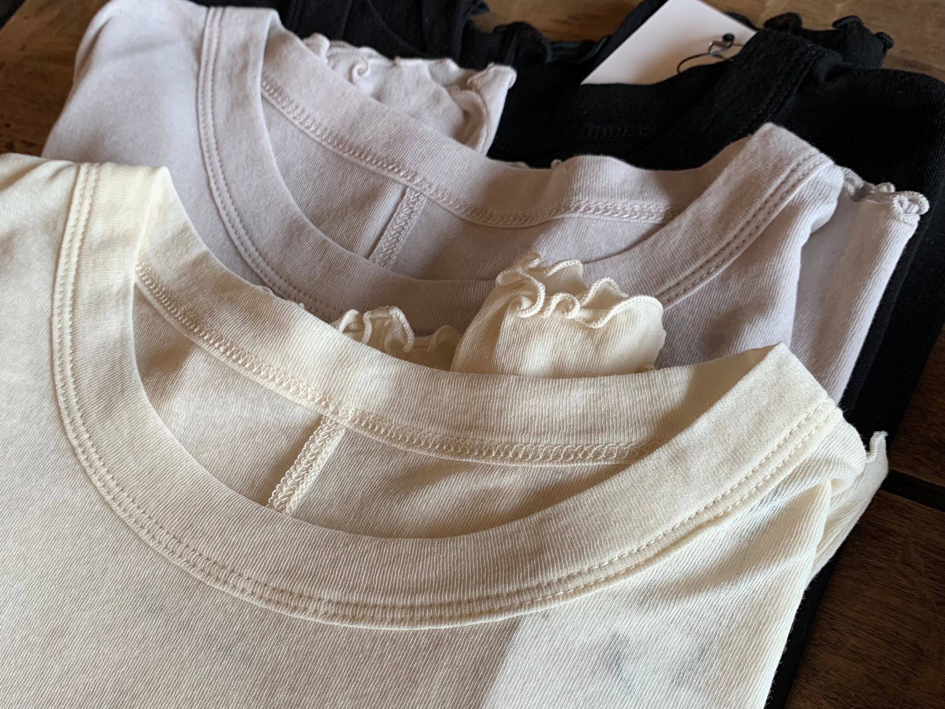 コットン100%でシャリっと気持ちの良い透け感のあるクルーネックP/O。裾や袖口にウェーブがあり、袖口からちらっと見えるとかわいいです。