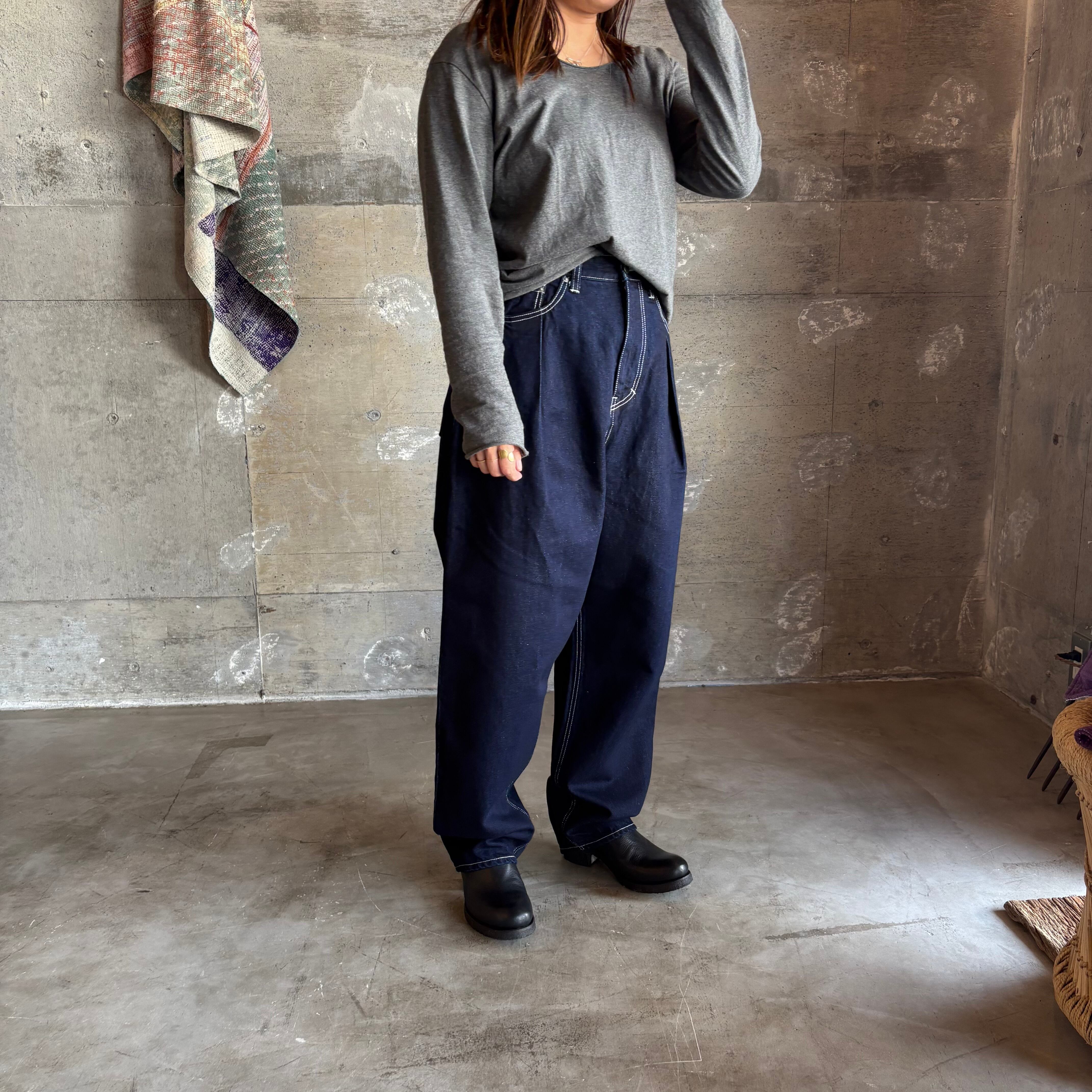 昔のシャトル機械で織ったセルビッチデニム生地で作られた、幅広でゆるめのテーパードデニム。前にタックが入っており、トップスをインしてのコーディネートも綺麗に仕上ります。柔らかな風合いと麻のしなやかさがあり、上質な質感に仕上がっています。ポケットは前・後ろに2つずつと、前右に小さなポケットがついています。
