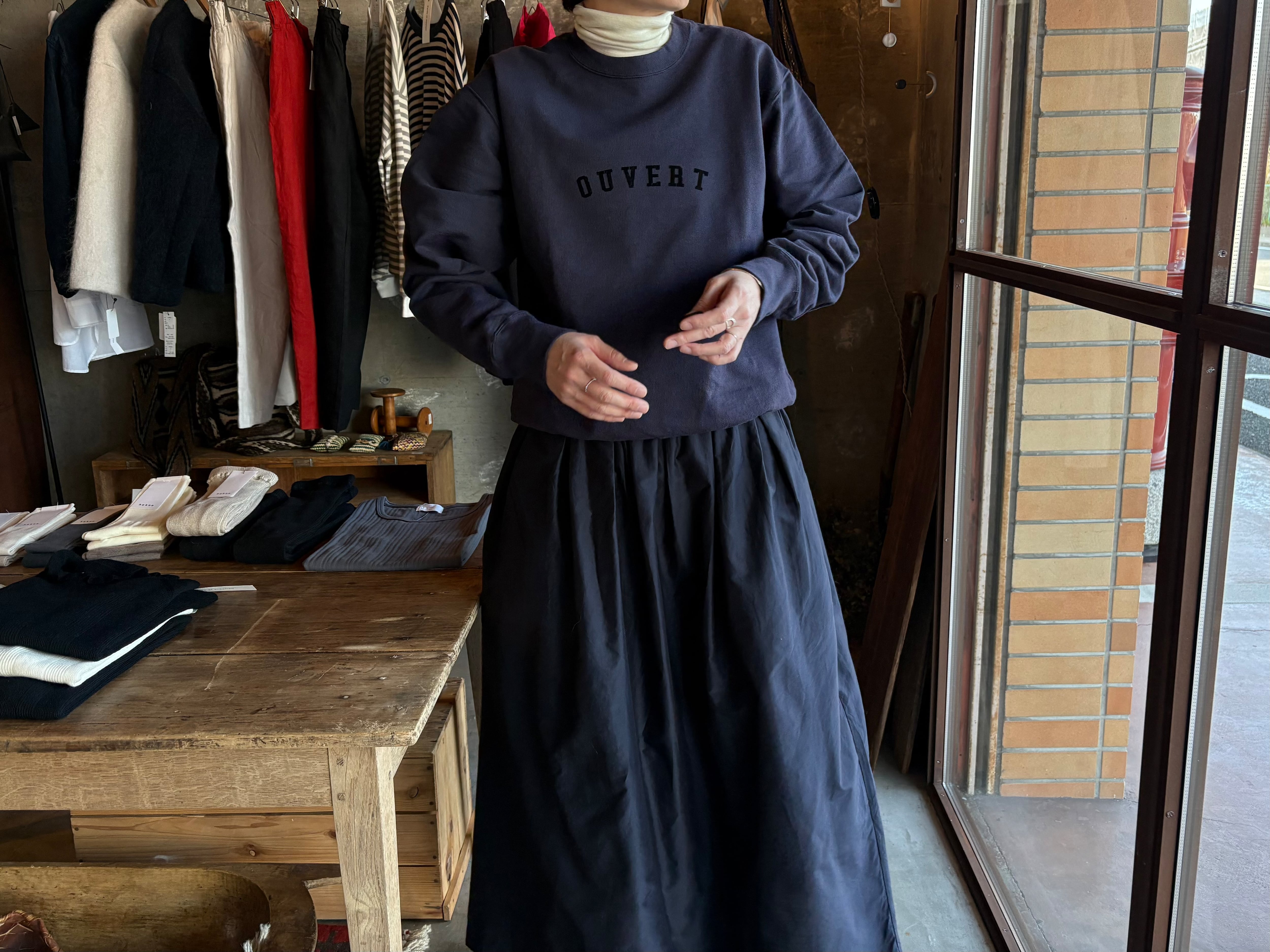 OUVERT ウーヴェルのロゴスウェット。袖が長くダボっとしているのがポイントです。ロングスカートとヒールの靴と合わせでフェミニンな着こなしや、ボーイッシュコーディネートなど幅広く着こなしができます。中にタートルニットやシャツ合わせなどアレンジしてもきまります。