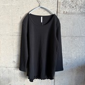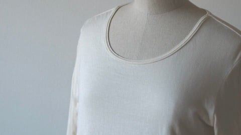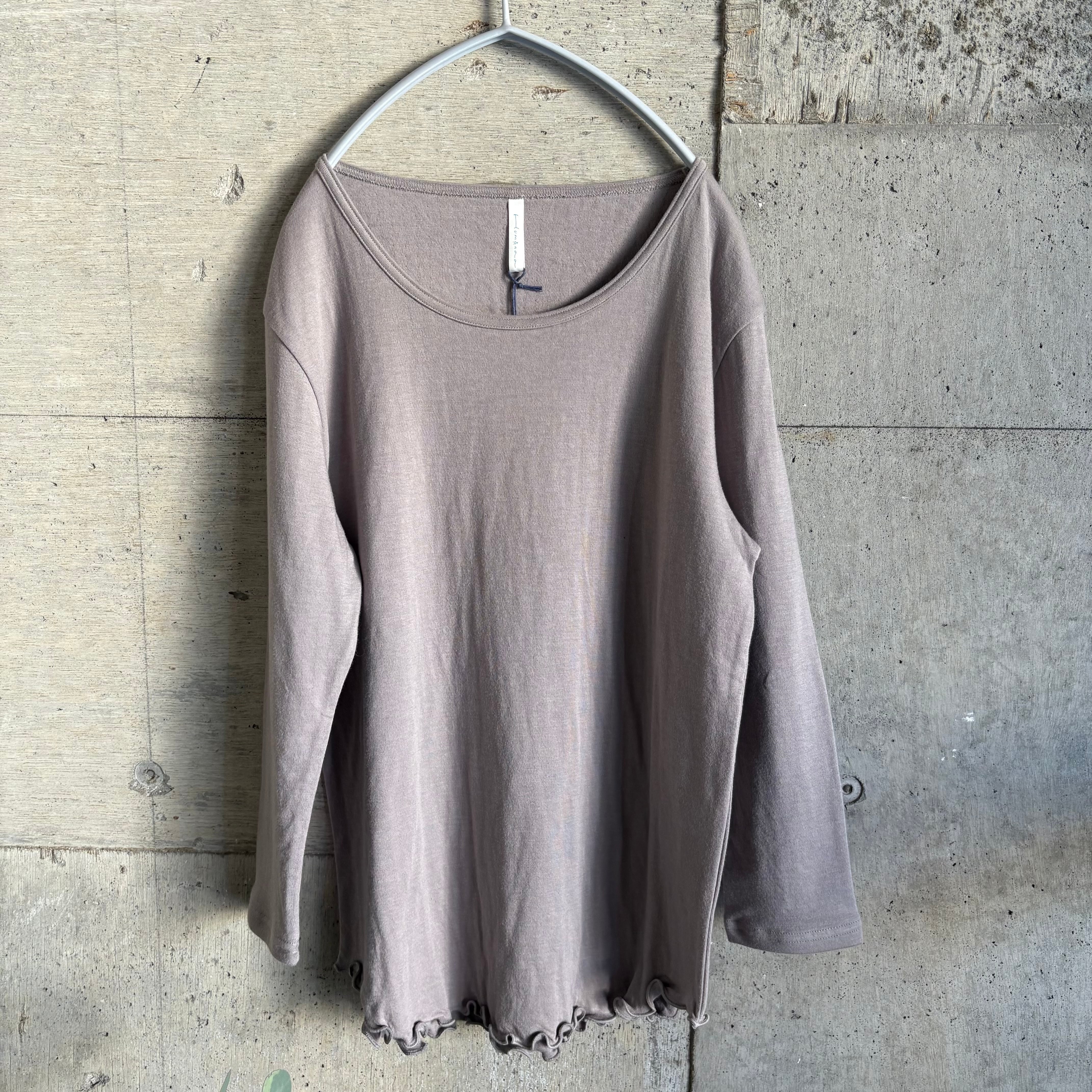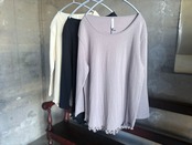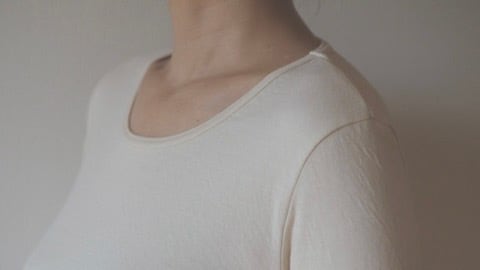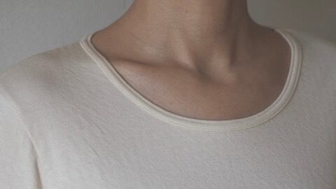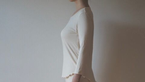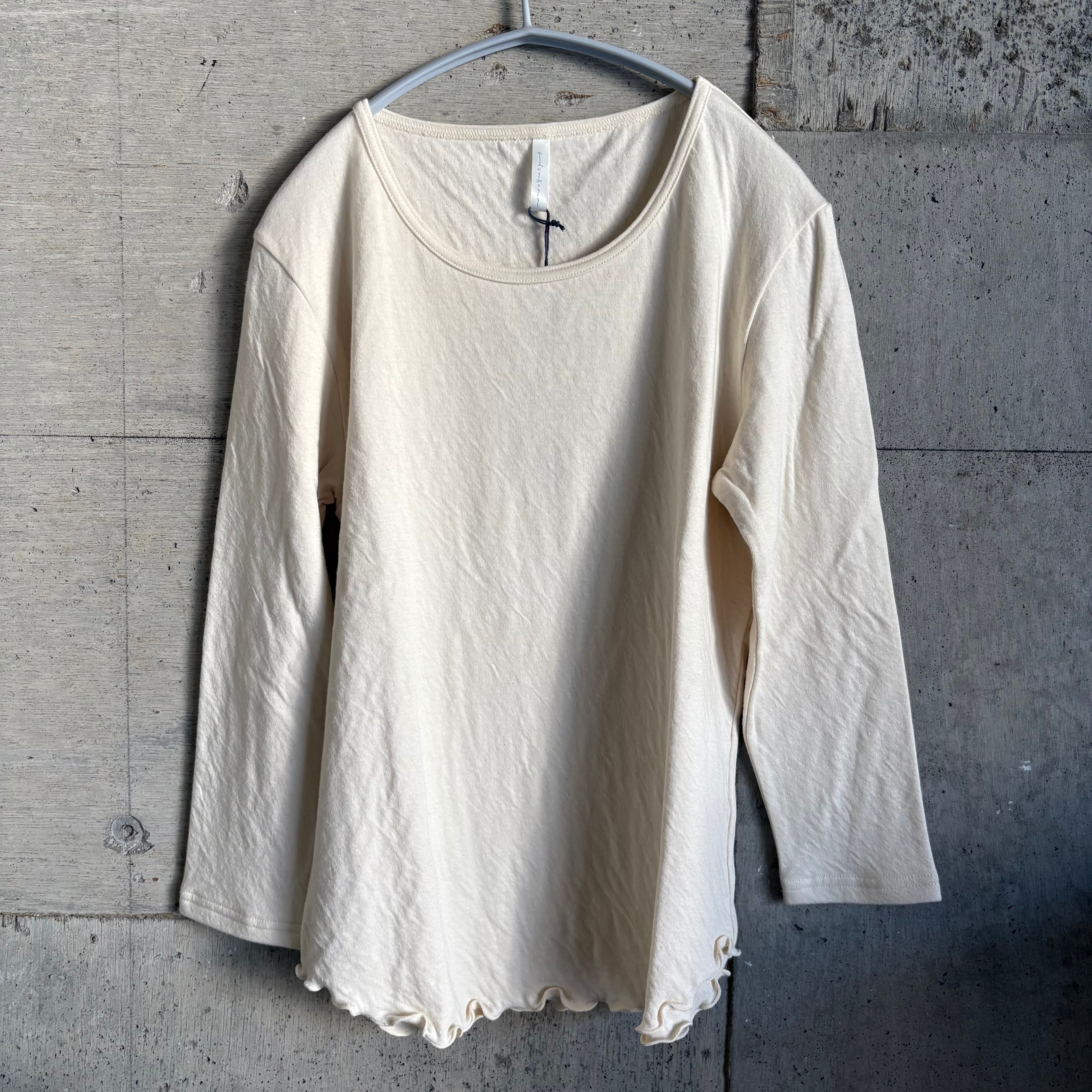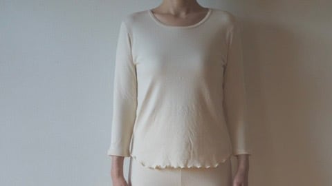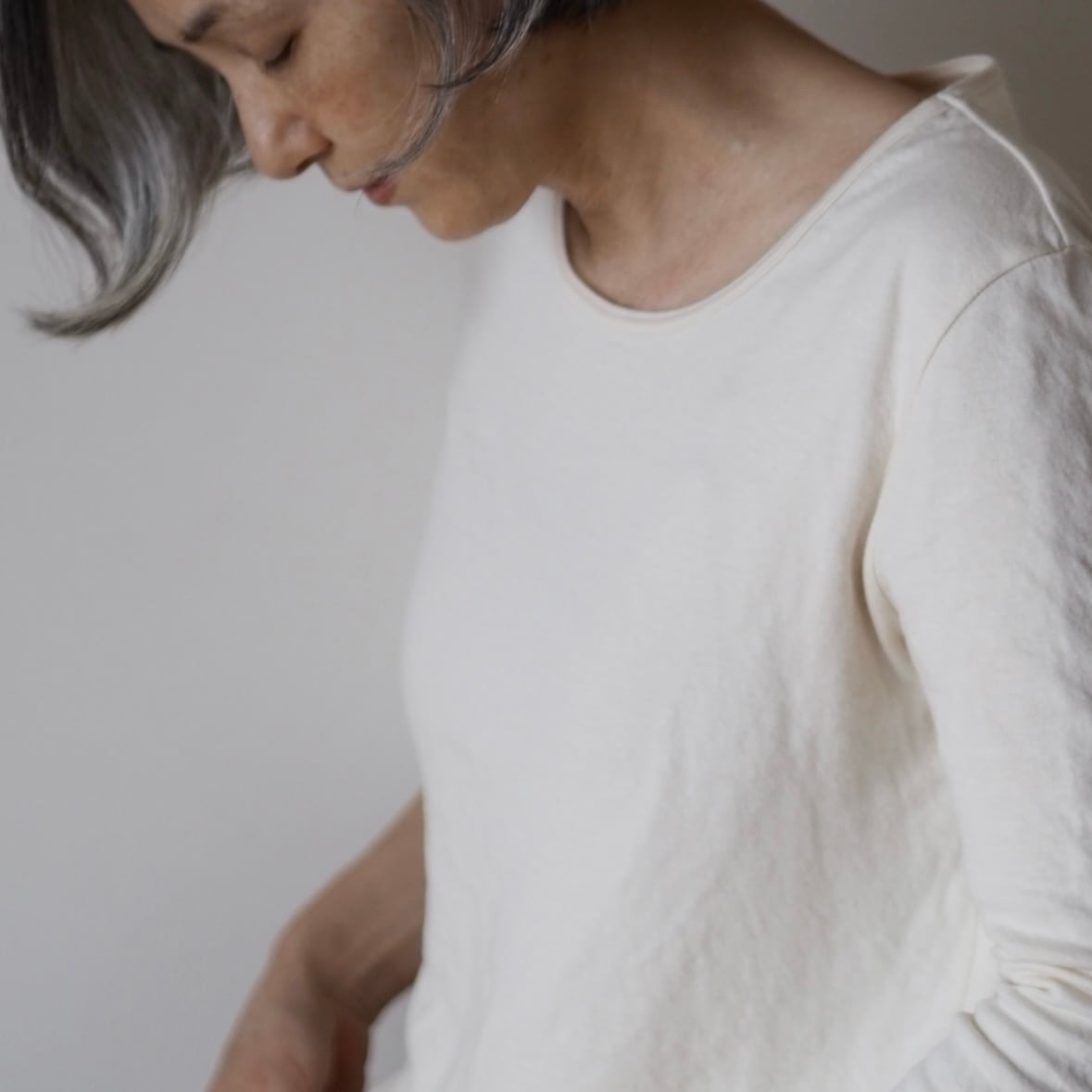 袖丈は洋服からはみ出ない8分丈袖。100%オーガニックコットンの2枚生地を糸でつなぎ合わせた接結生地は、重なった2枚の隙間に空気を含んで、冬はふんわり暖かく、夏は通気性が良く、洗いをかけるとくしゅっと独特のシワ感が出て、柔らかく風合いが増すのが特徴です。伸縮性もありストレスフリーな1枚です。冬場はとにかく暖かく頼もしい1枚です。